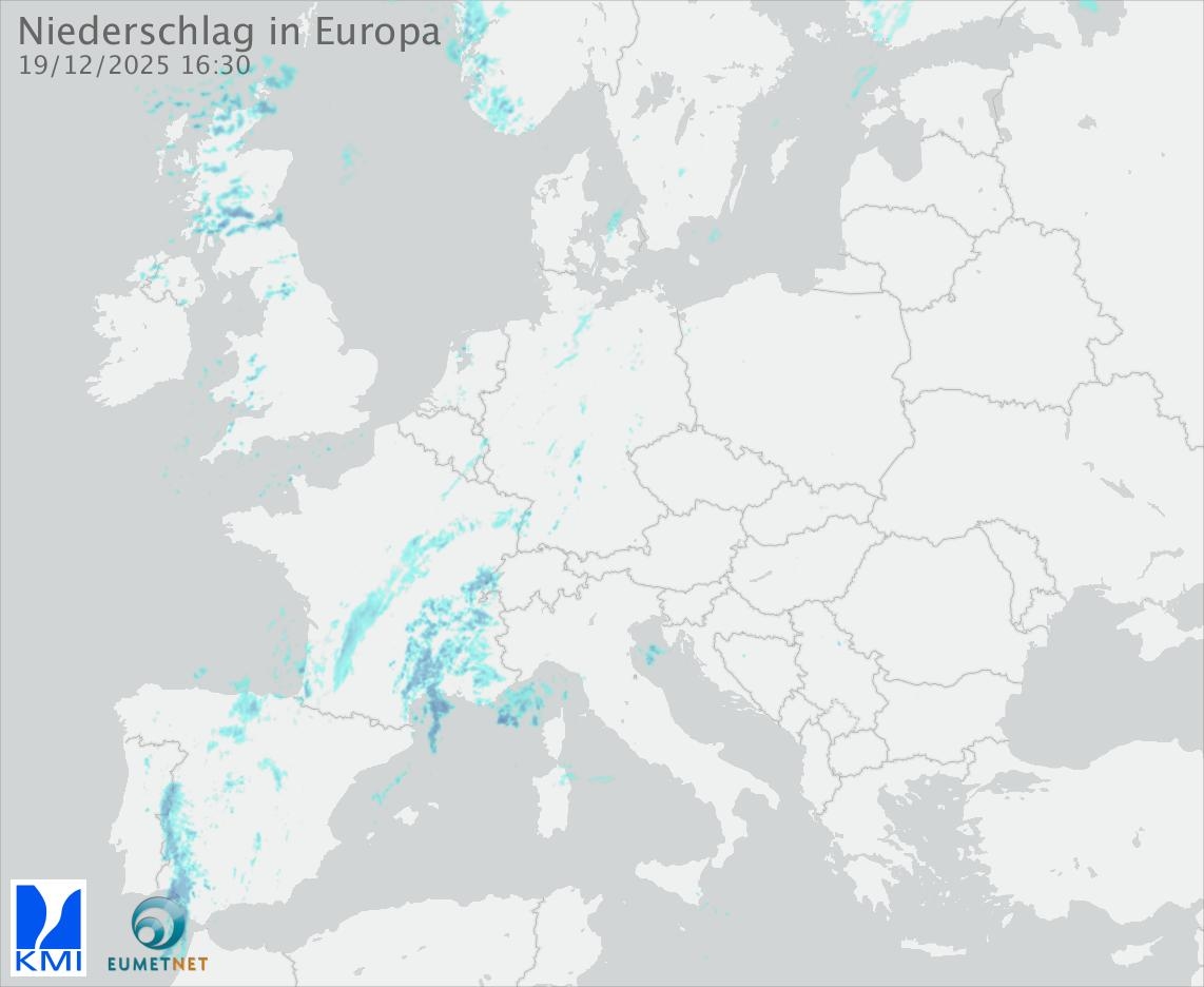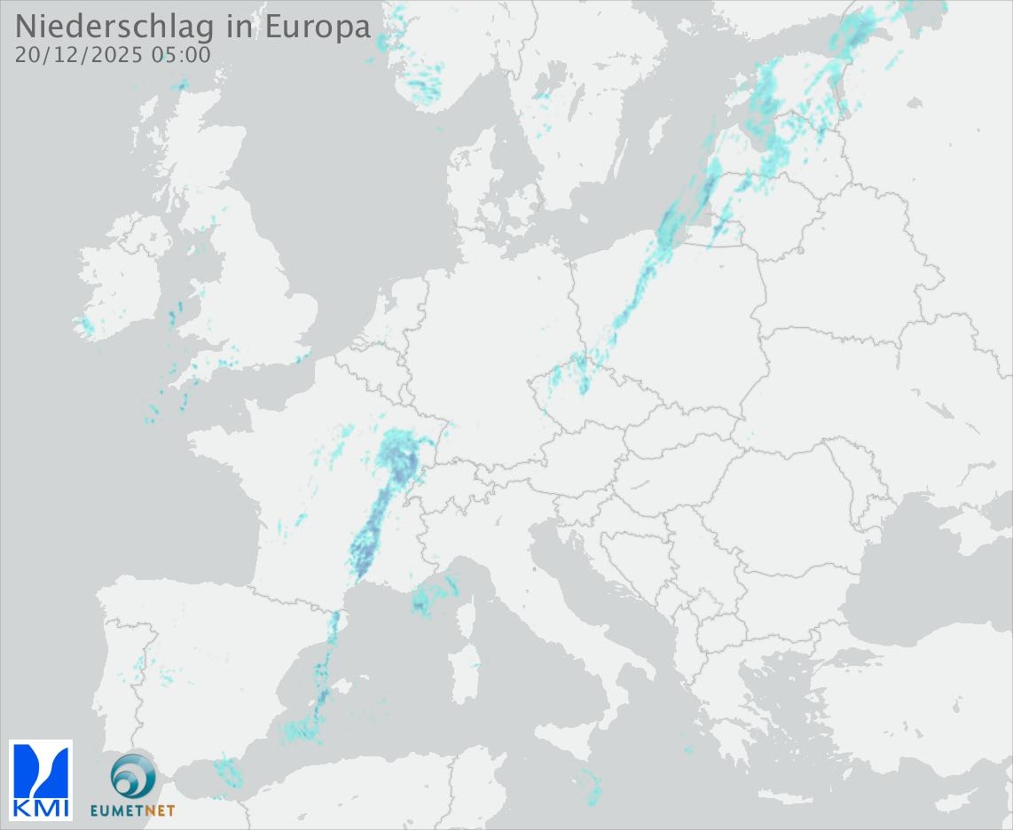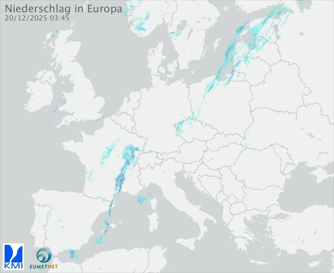Diese Animation zeigt den gefallenen Niederschlag, gemessen durch die Regenradargeräte der europäischen Teilnehmer des Eumetnet-Programms OPERA (in 15-Minuten-Intervallen).