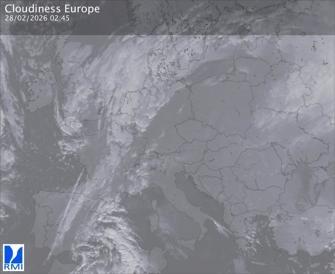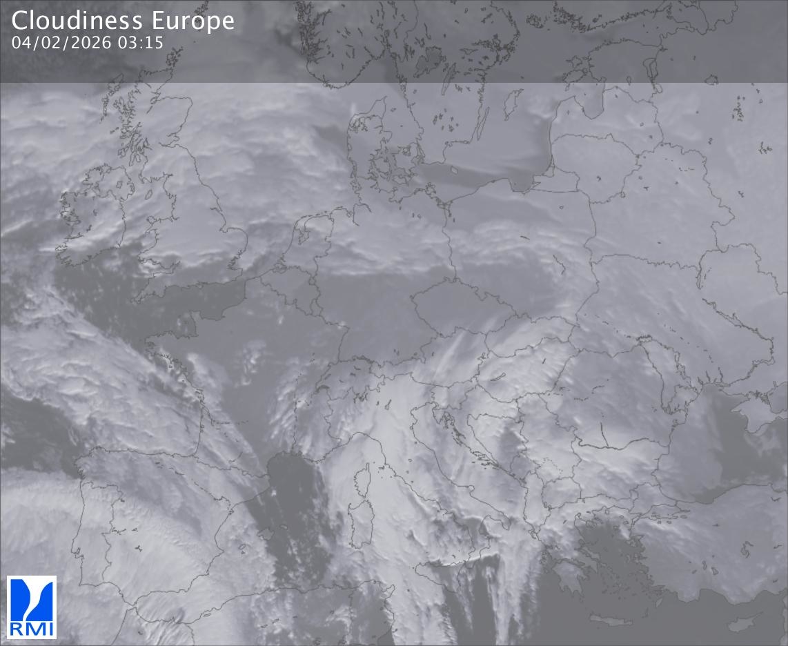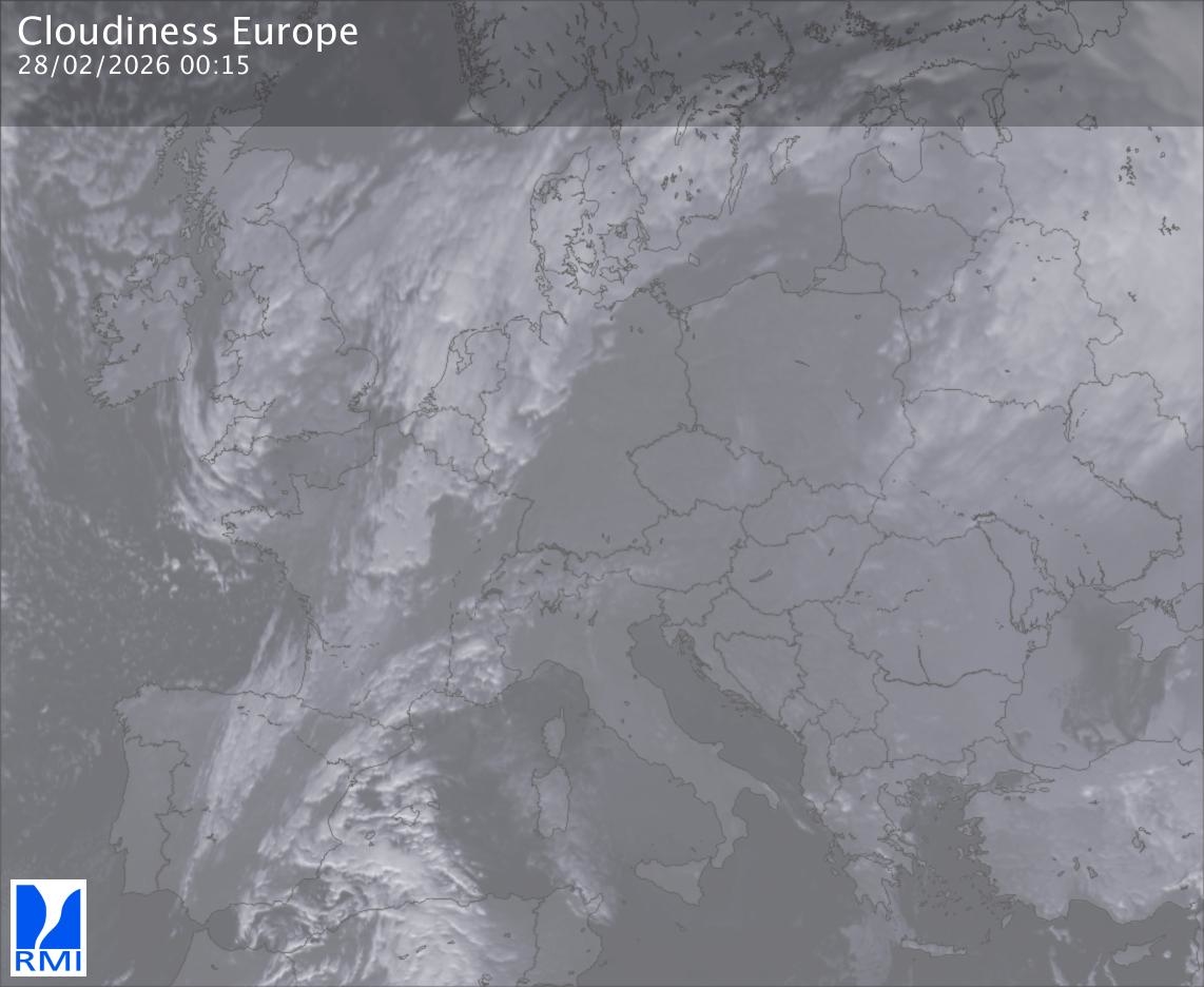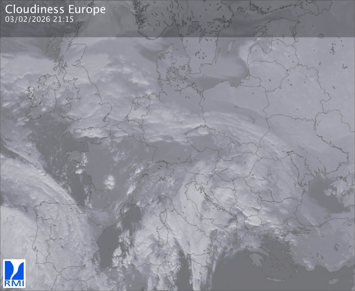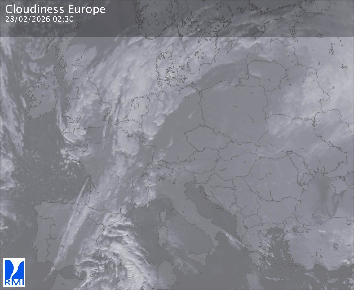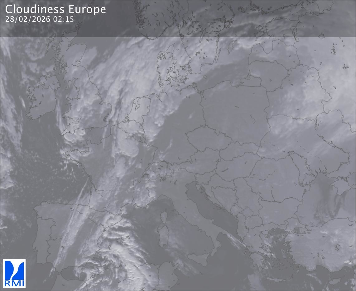 The satellite image of Europe is composed by using both the infrared and the visible light channel from the satellite. Because there are no usable visible light images during the night this composition of channels gives us an image that can be used to observe the clouds by day and by night. The pixelated artifacts are due to the lower resolution of the infrared channel.