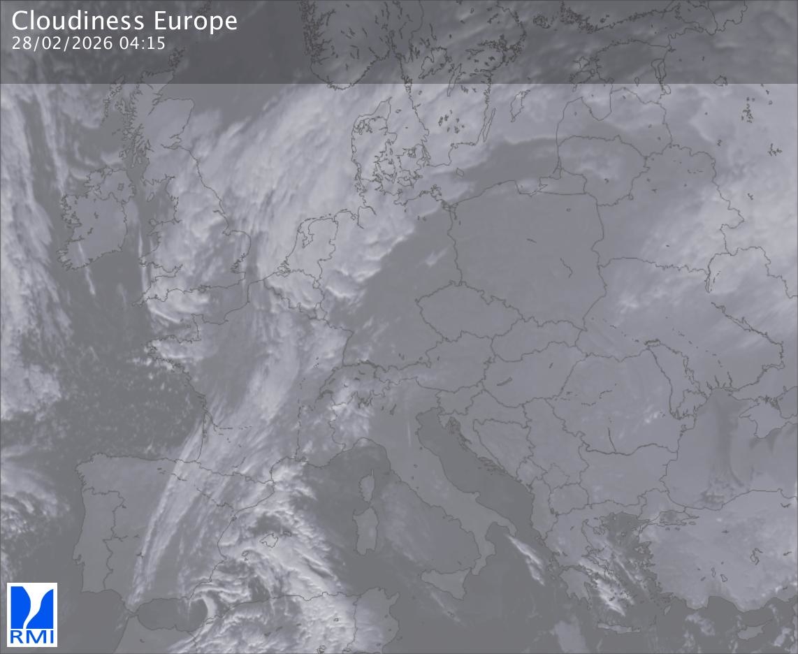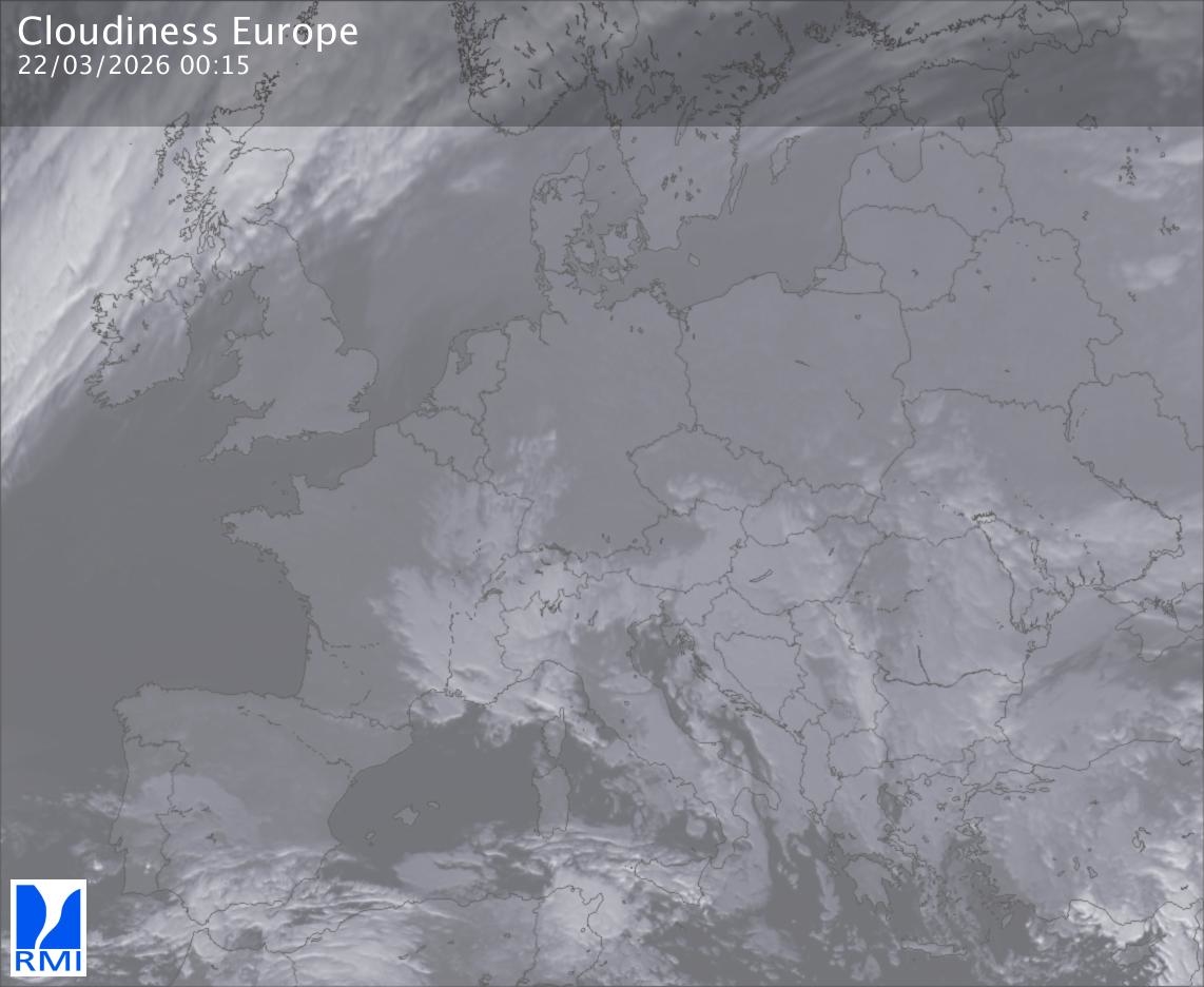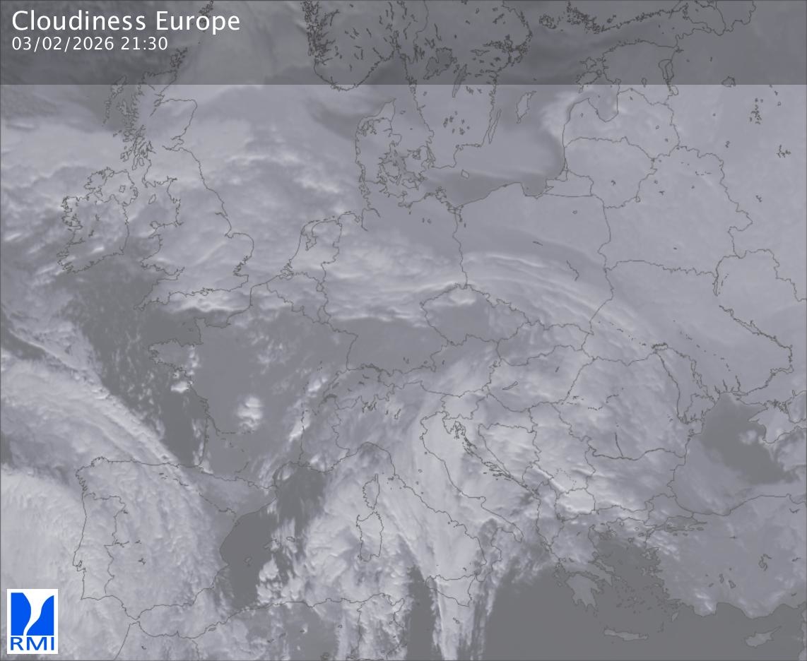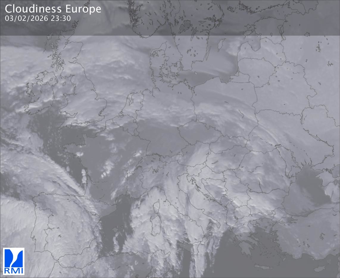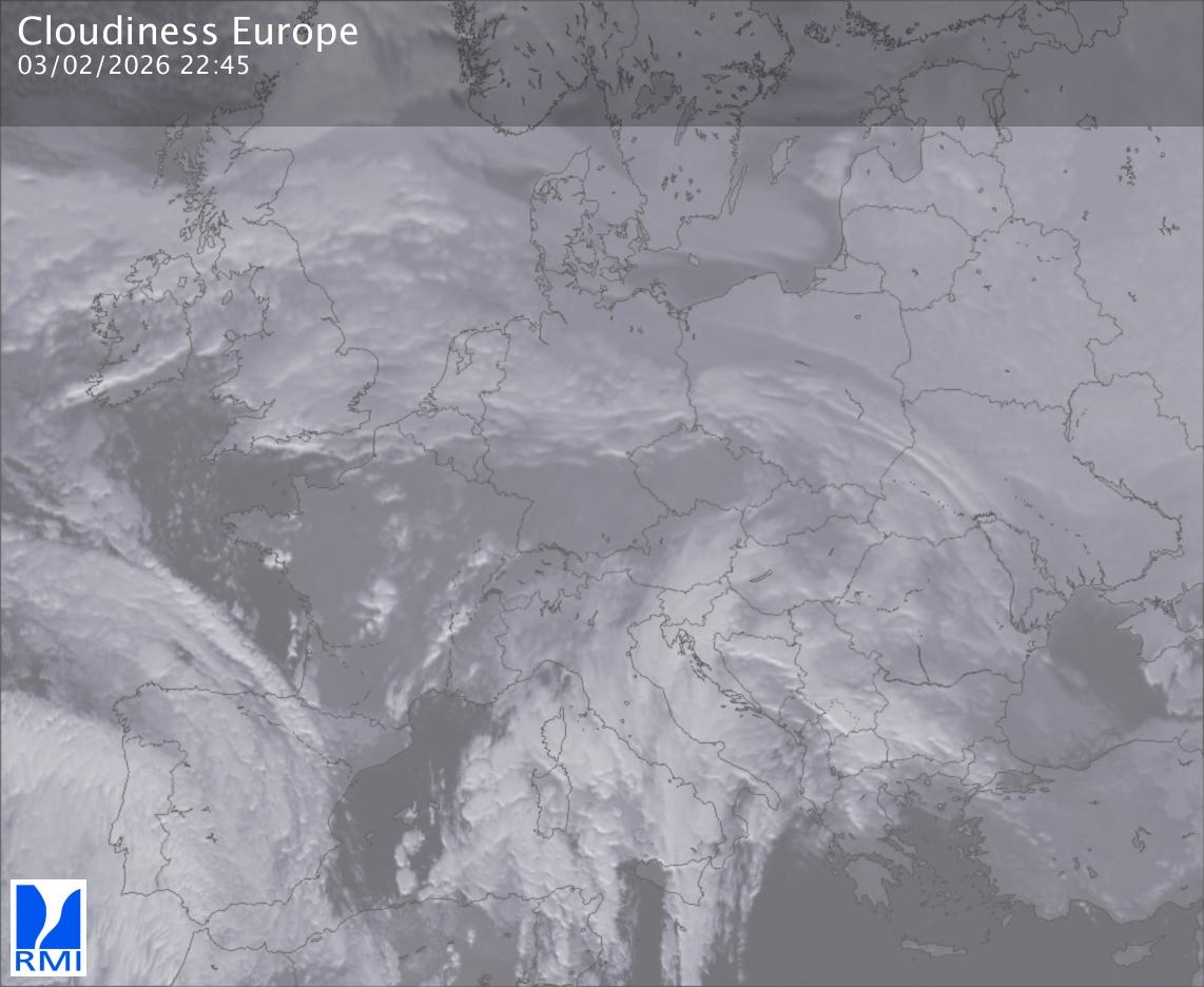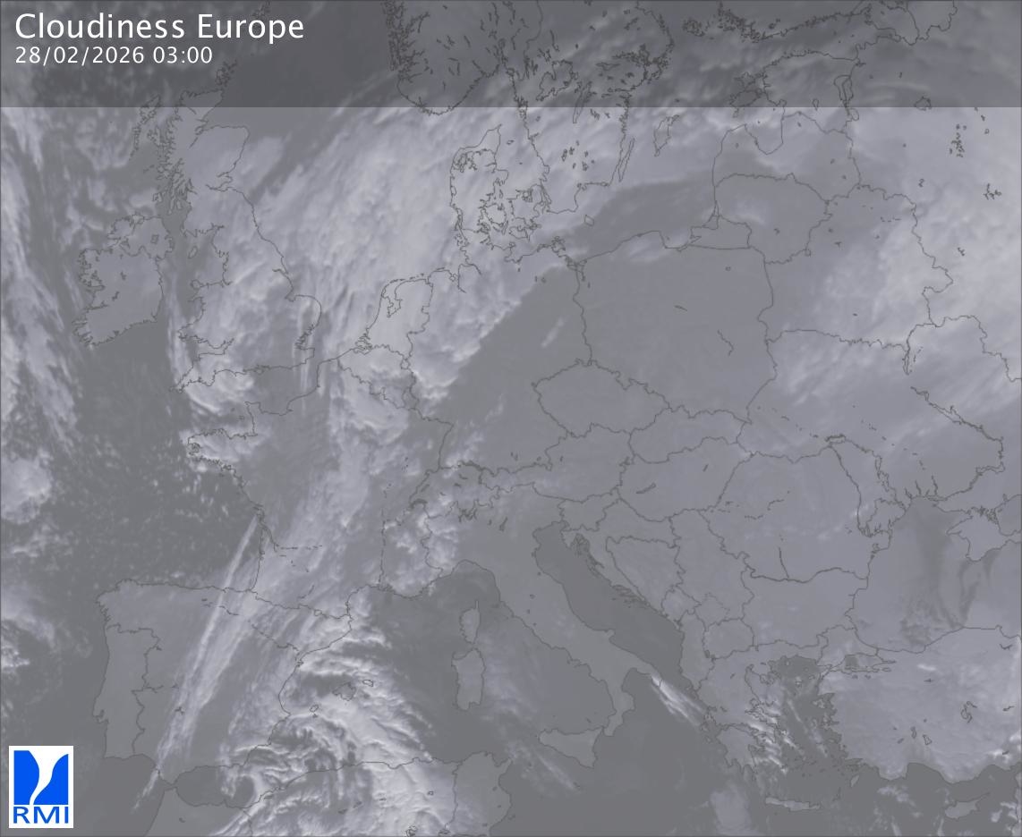The satellite image of Europe is composed by using both the infrared and the visible light channel from the satellite. Because there are no usable visible light images during the night this composition of channels gives us an image that can be used to observe the clouds by day and by night. The pixelated artifacts are due to the lower resolution of the infrared channel.