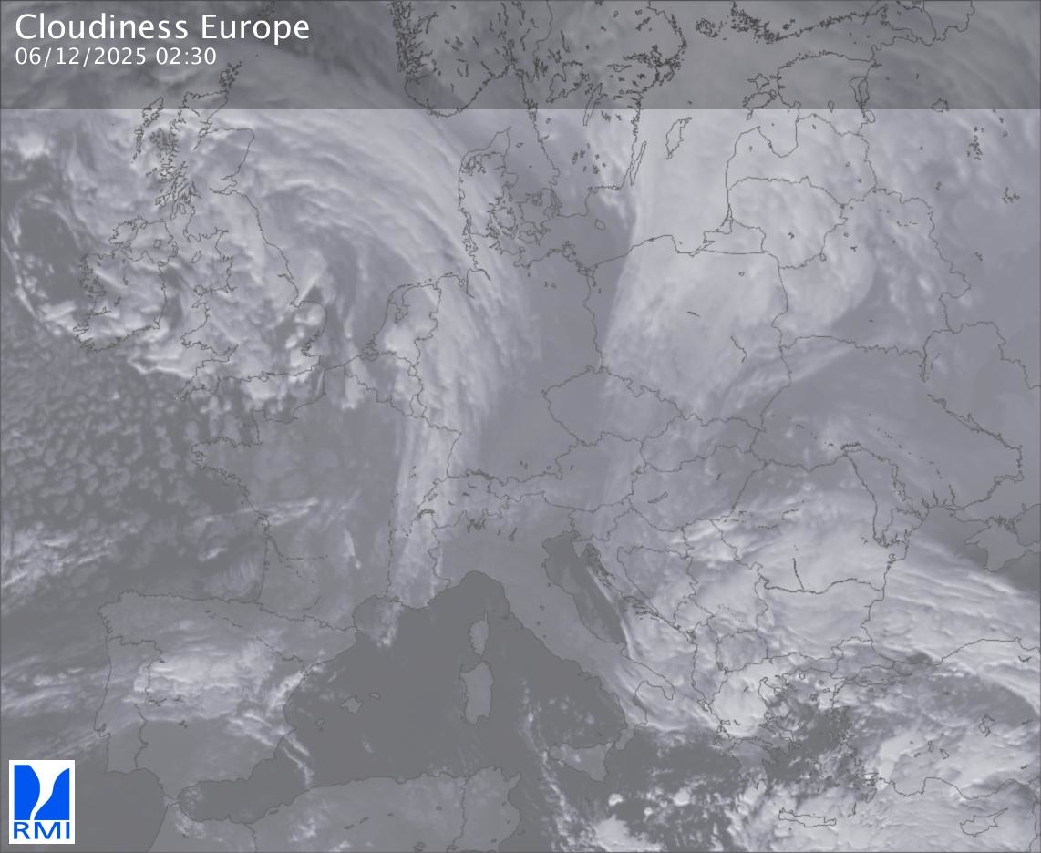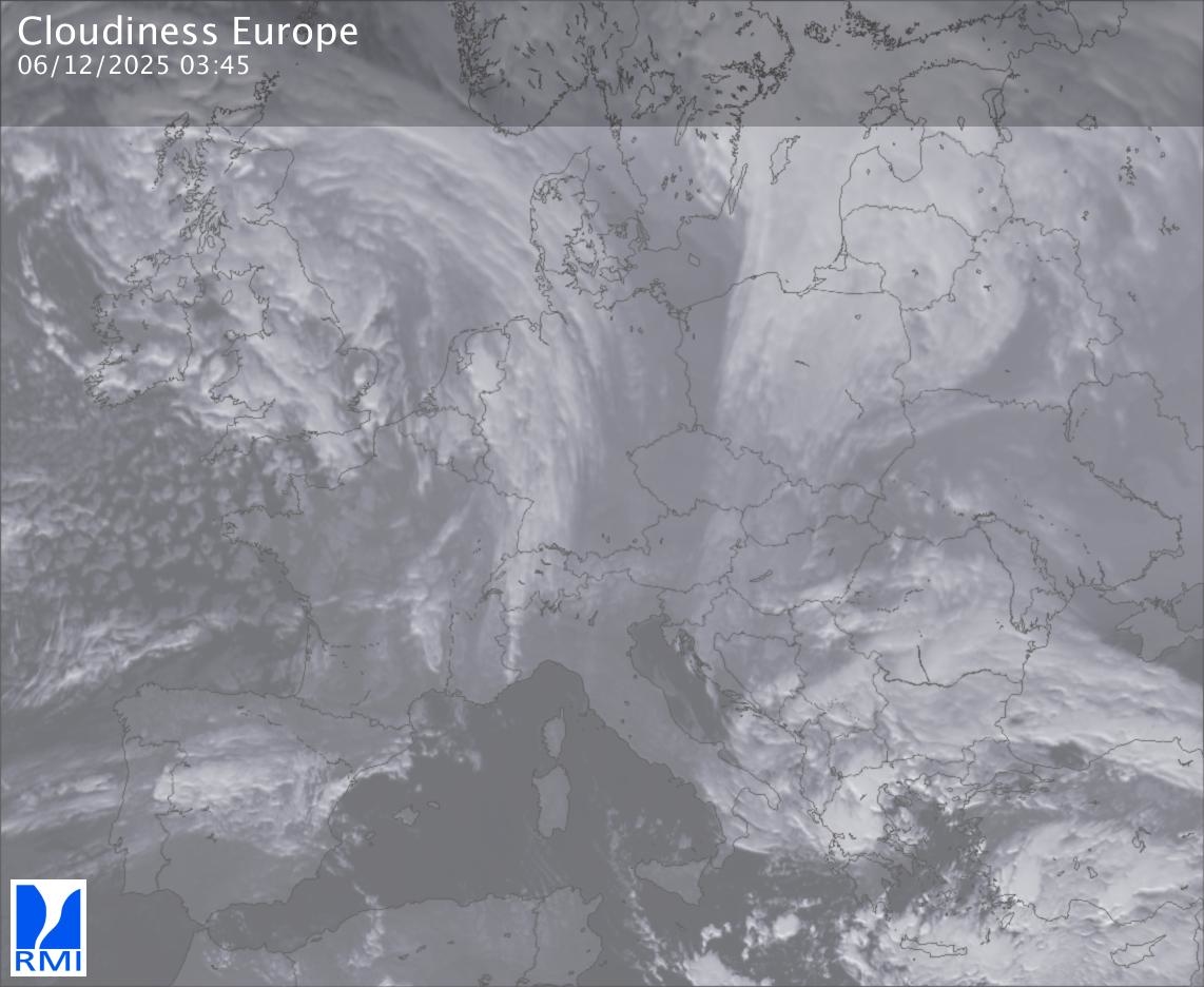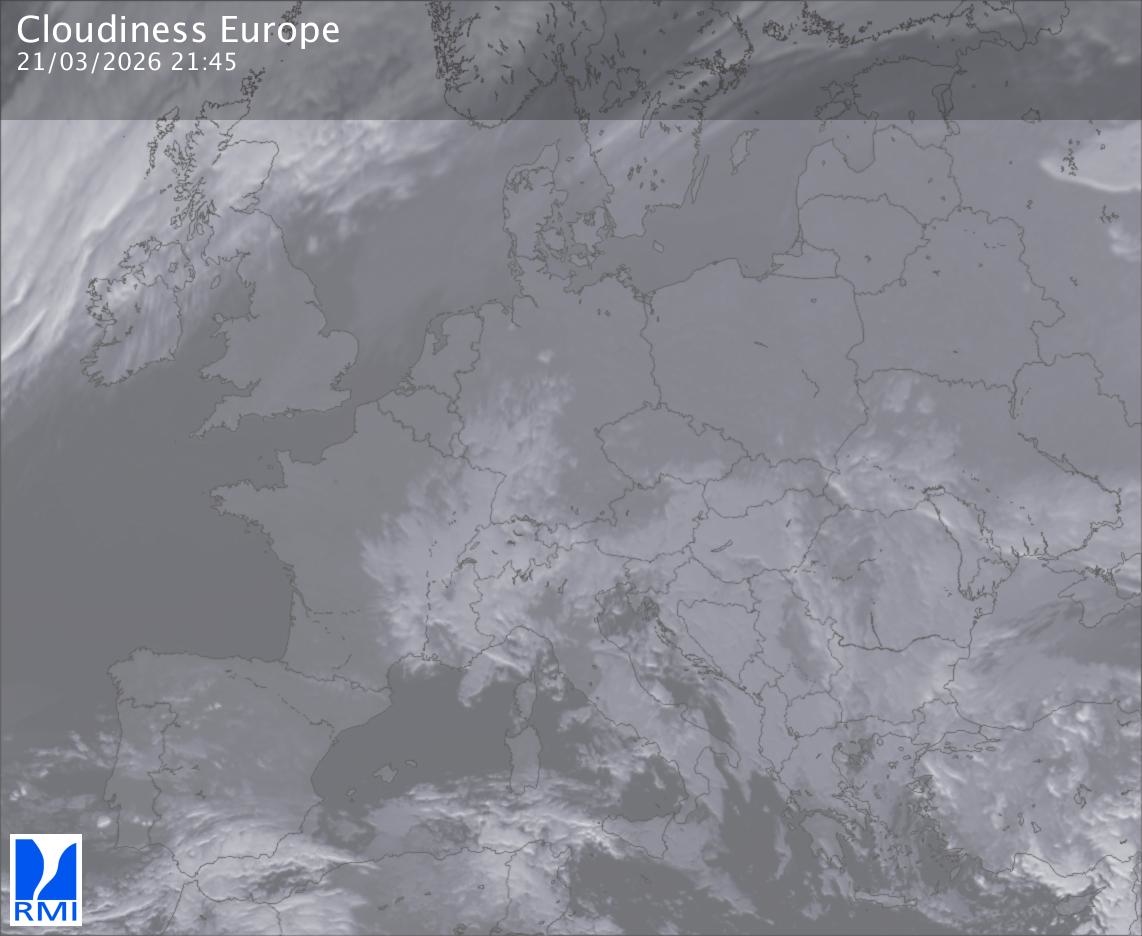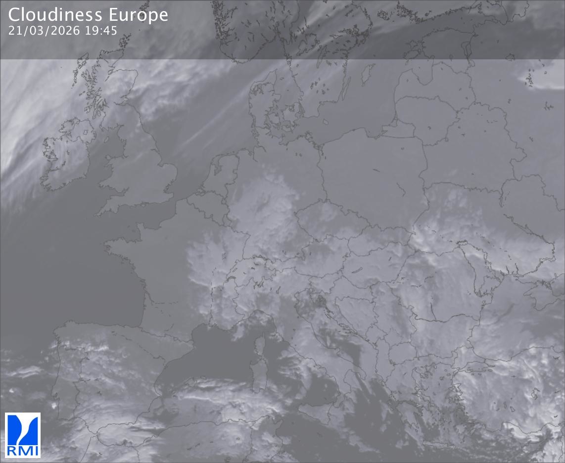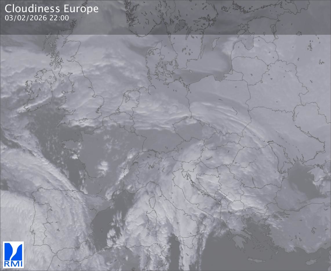 The satellite image of Europe is composed by using both the infrared and the visible light channel from the satellite. Because there are no usable visible light images during the night this composition of channels gives us an image that can be used to observe the clouds by day and by night. The pixelated artifacts are due to the lower resolution of the infrared channel.