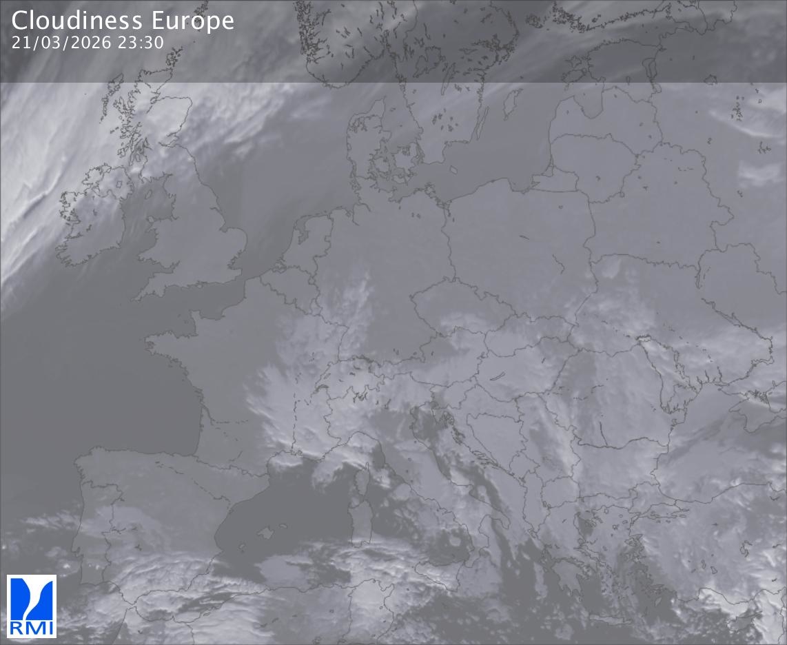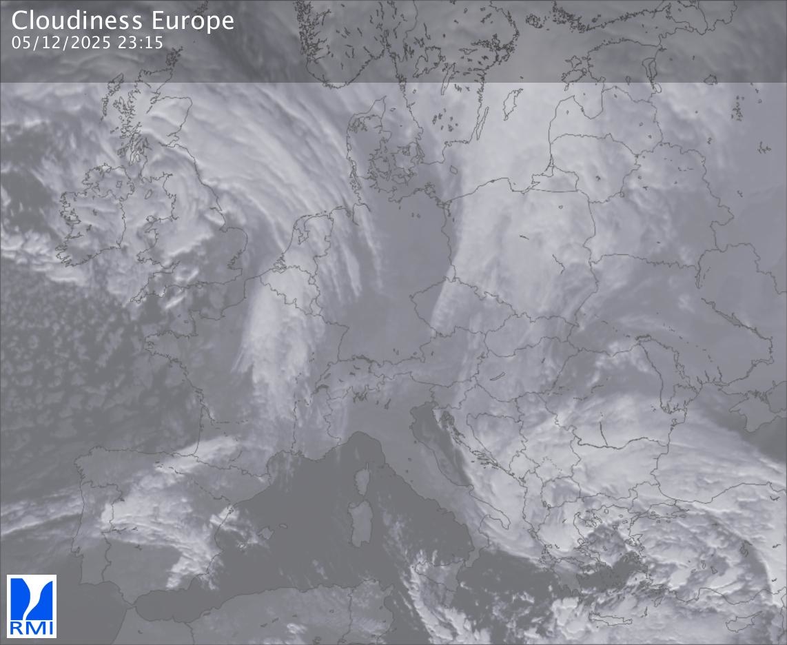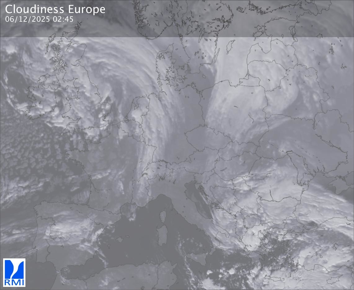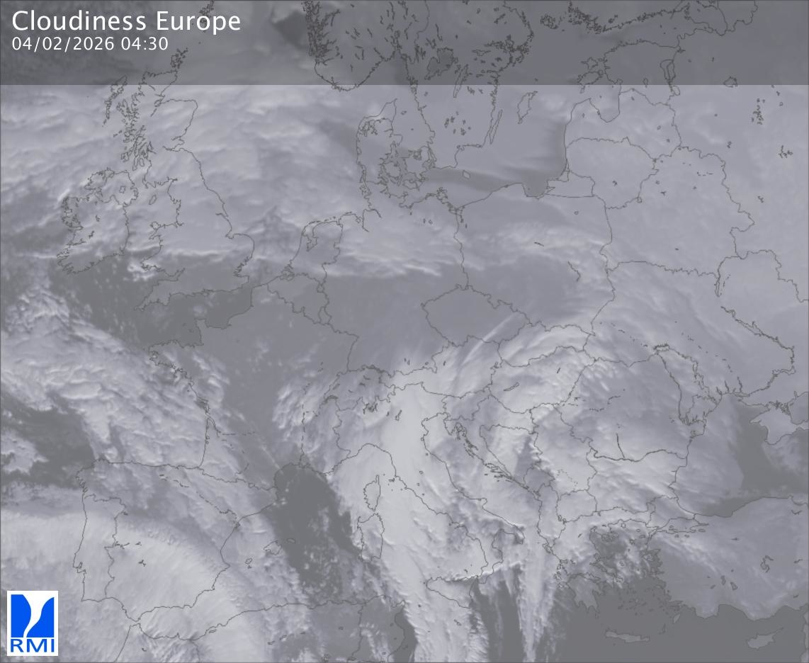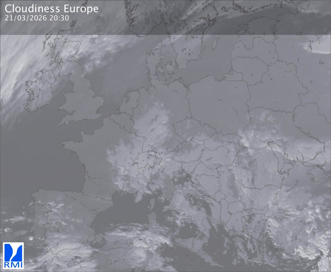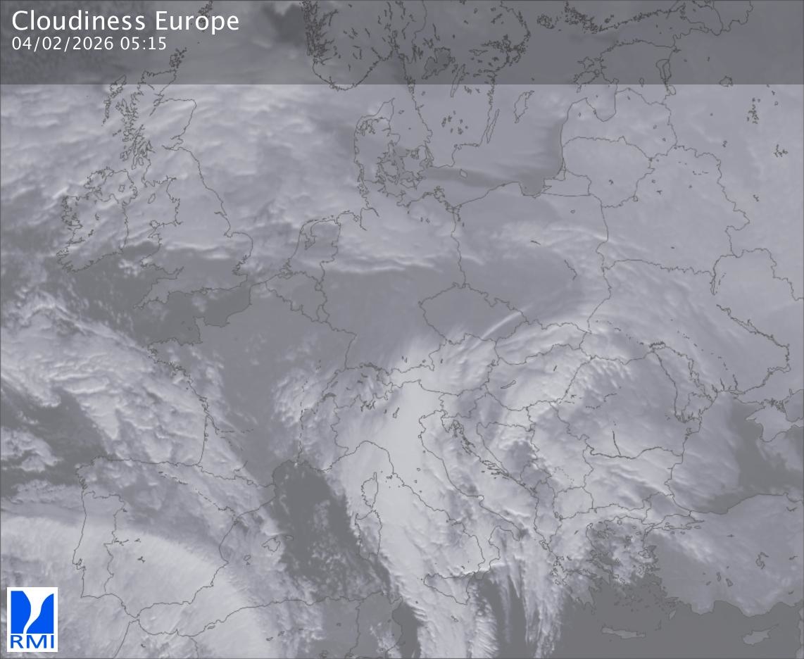 The satellite image of Europe is composed by using both the infrared and the visible light channel from the satellite. Because there are no usable visible light images during the night this composition of channels gives us an image that can be used to observe the clouds by day and by night. The pixelated artifacts are due to the lower resolution of the infrared channel.