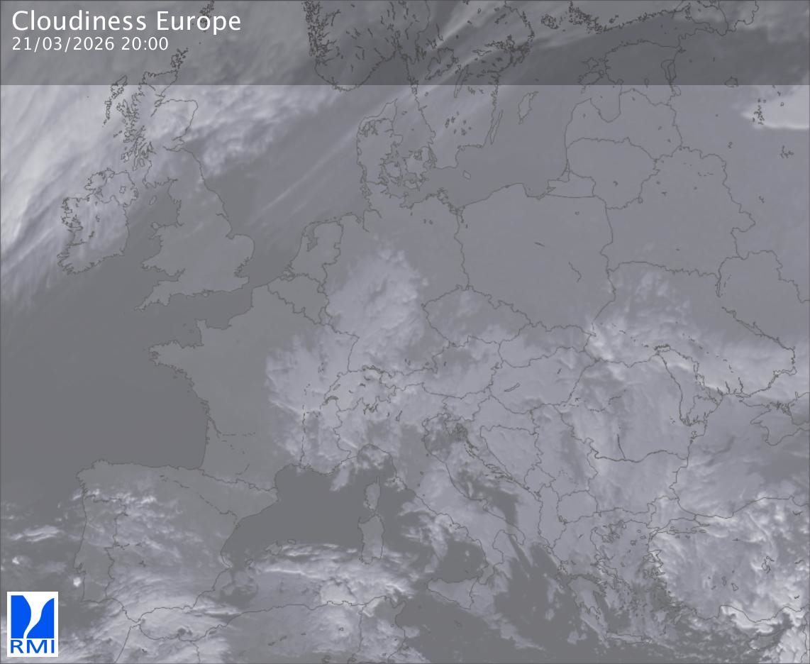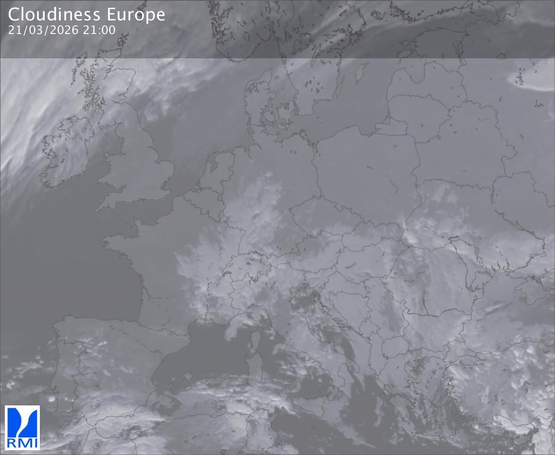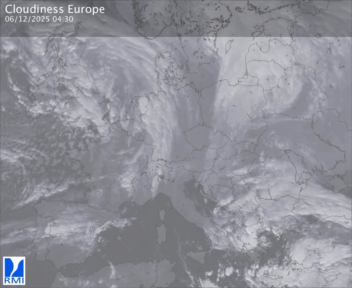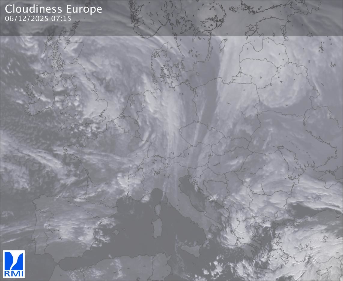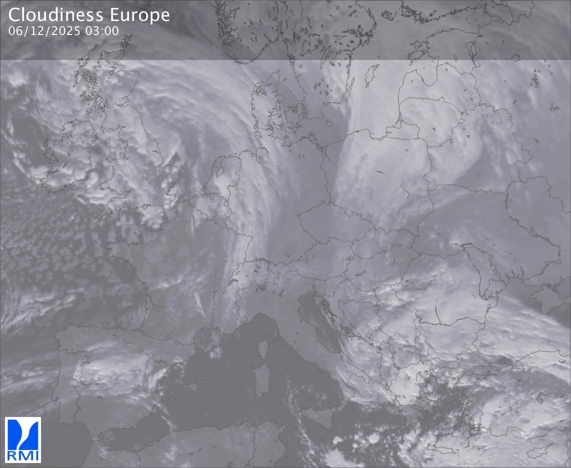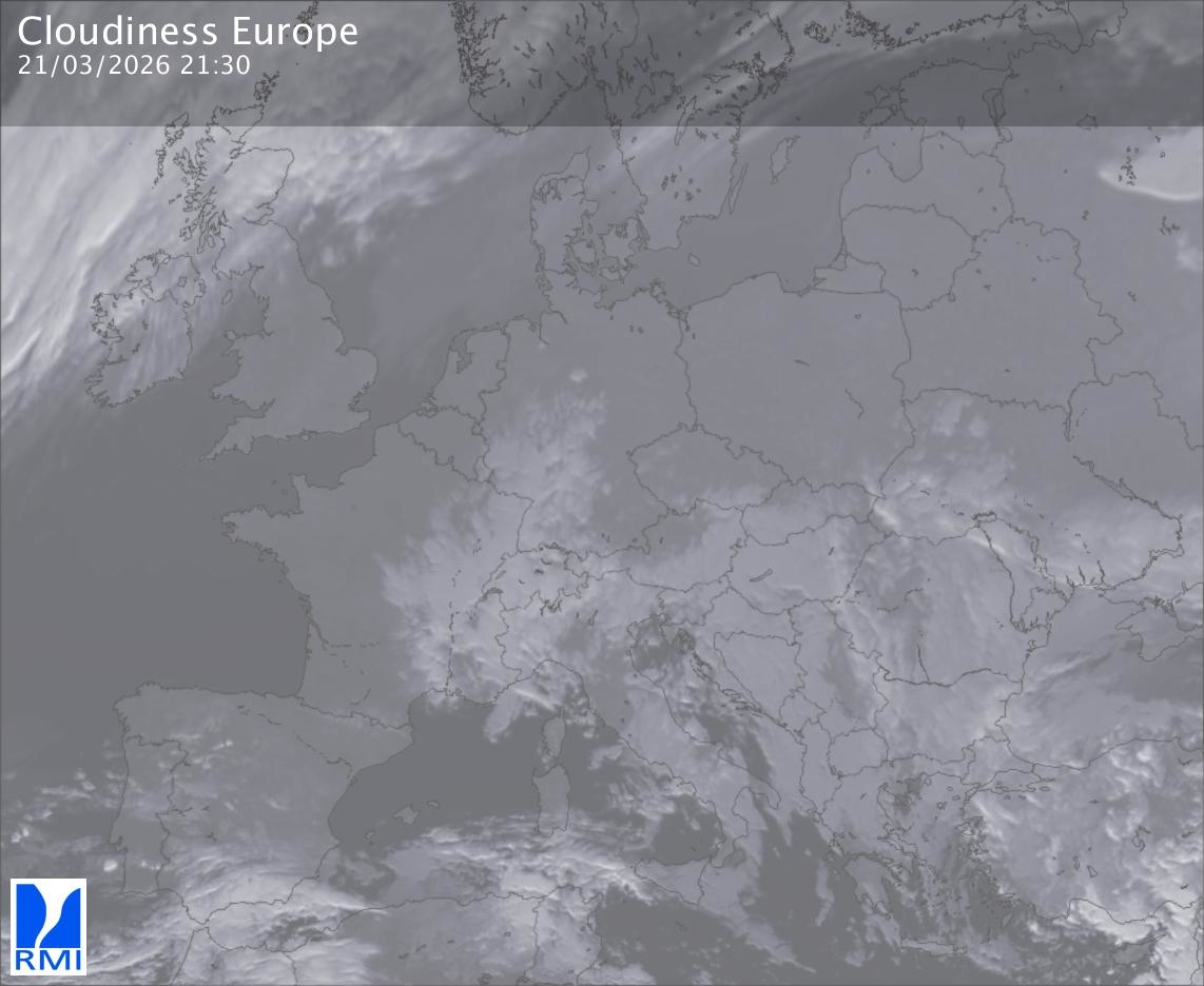The satellite image of Europe is composed by using both the infrared and the visible light channel from the satellite. Because there are no usable visible light images during the night this composition of channels gives us an image that can be used to observe the clouds by day and by night. The pixelated artifacts are due to the lower resolution of the infrared channel.