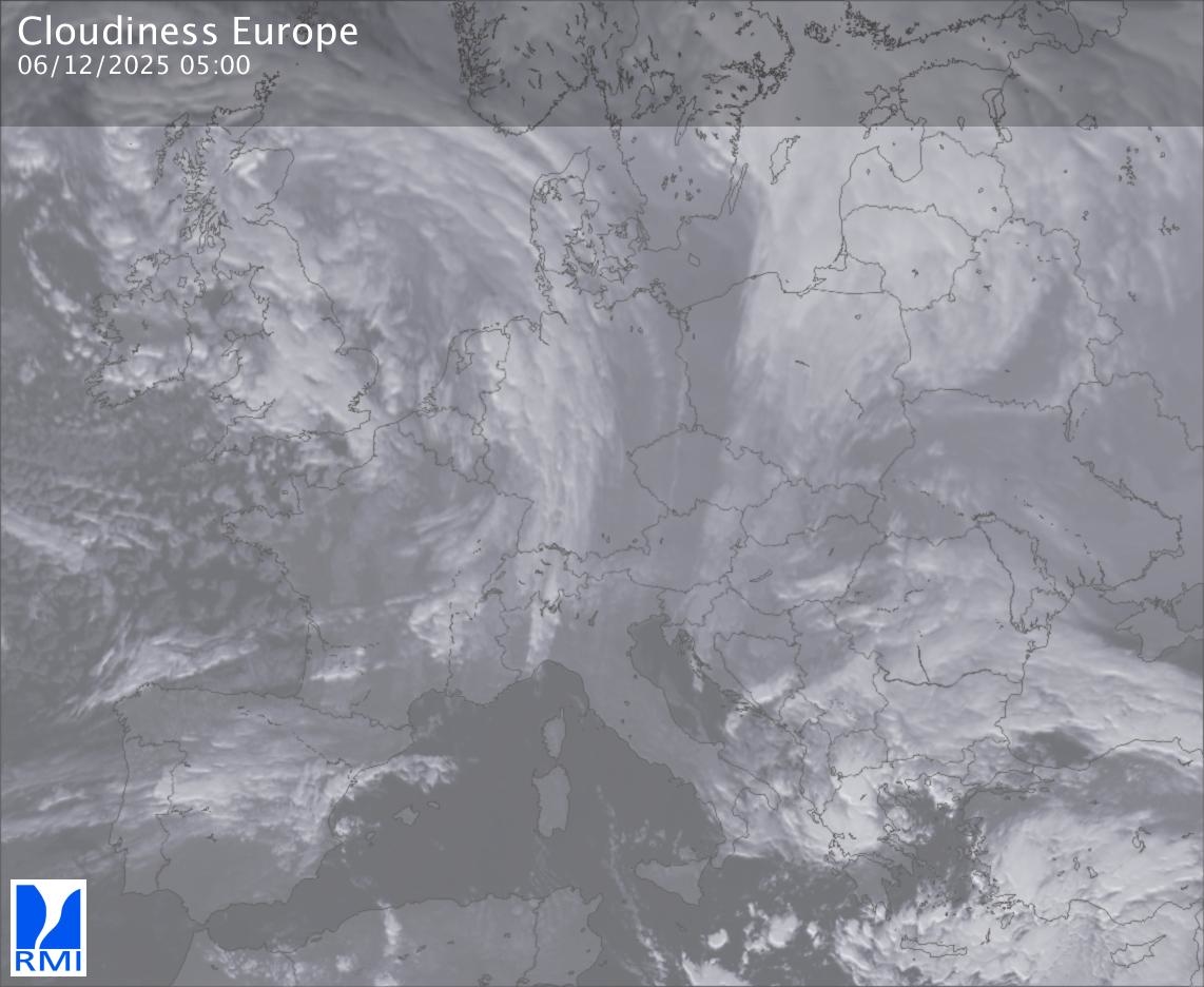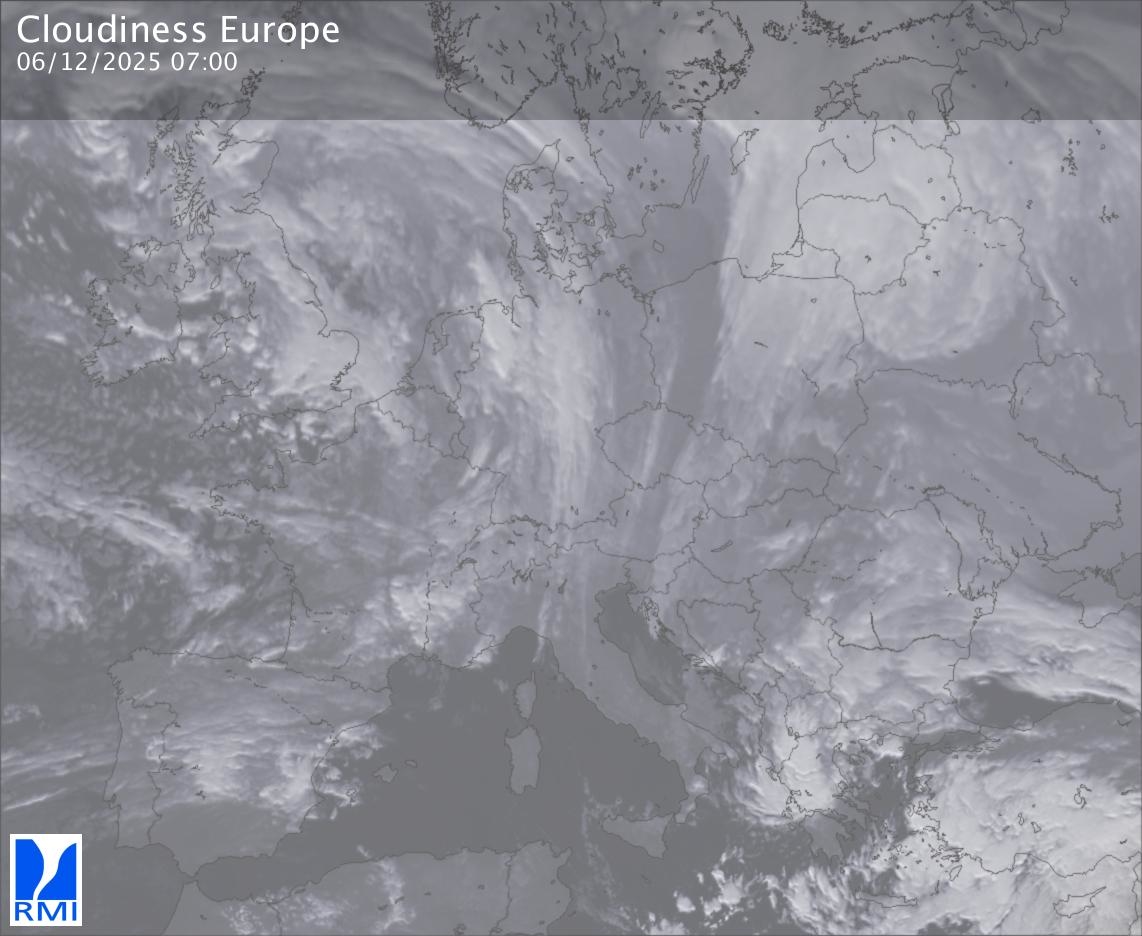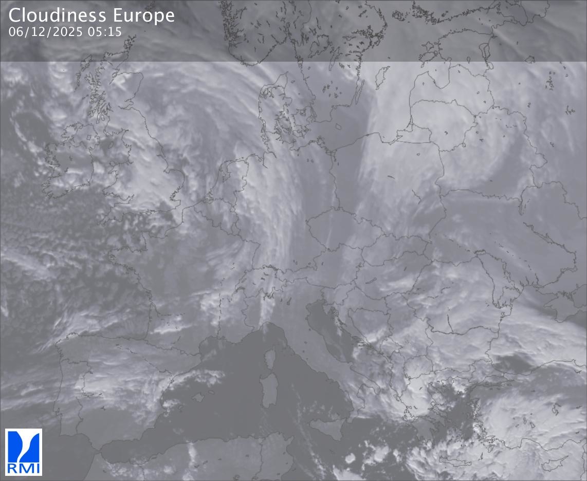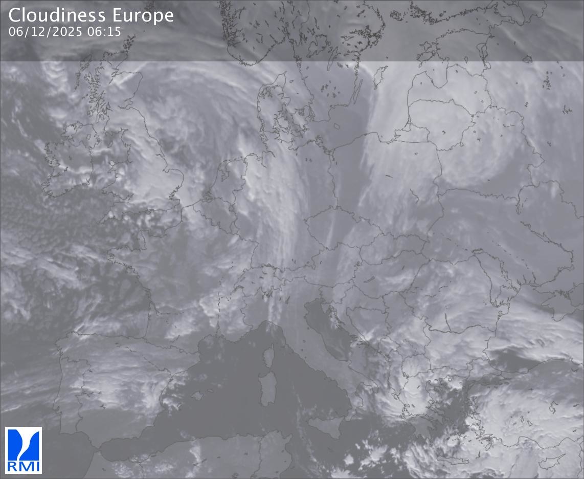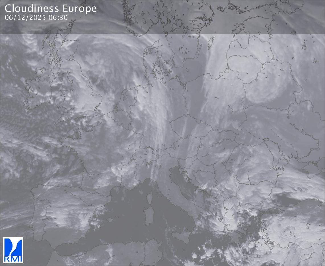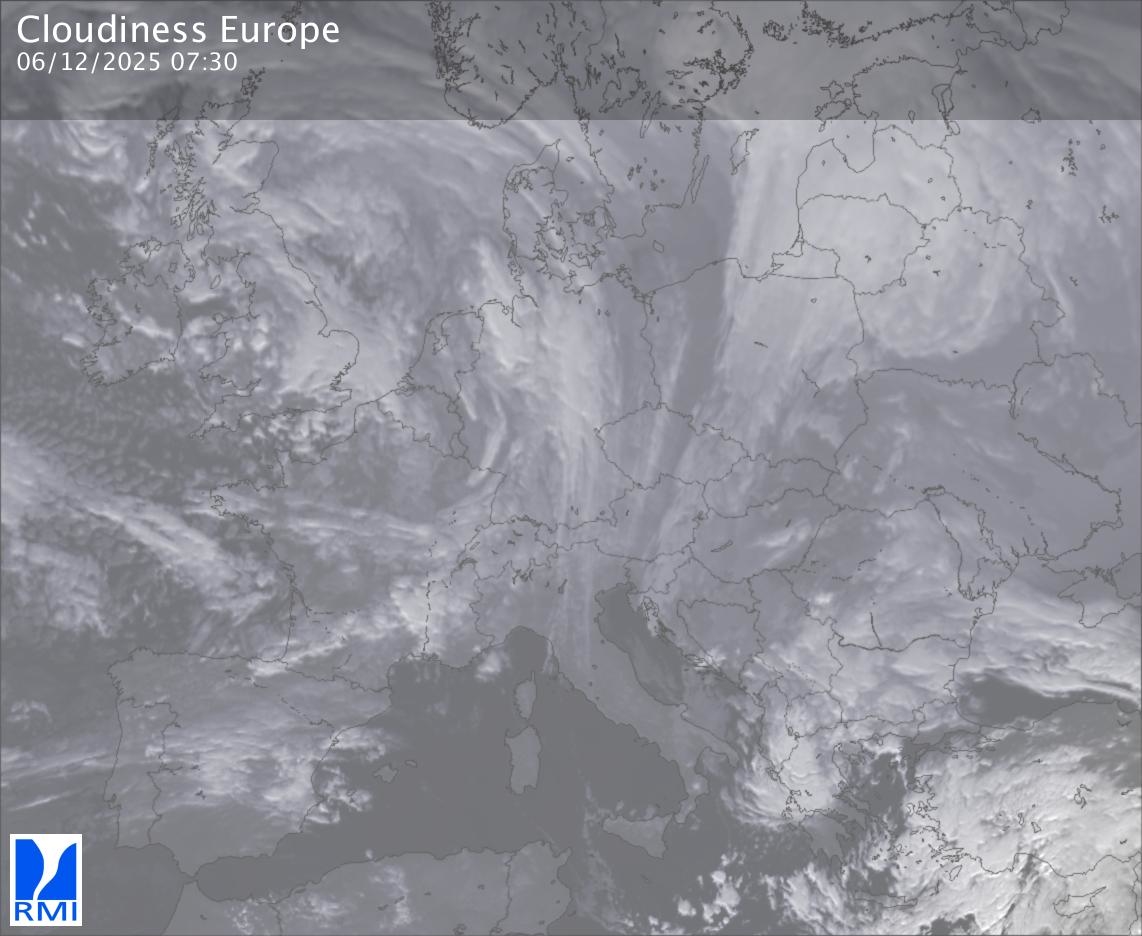 The satellite image of Europe is composed by using both the infrared and the visible light channel from the satellite. Because there are no usable visible light images during the night this composition of channels gives us an image that can be used to observe the clouds by day and by night. The pixelated artifacts are due to the lower resolution of the infrared channel.