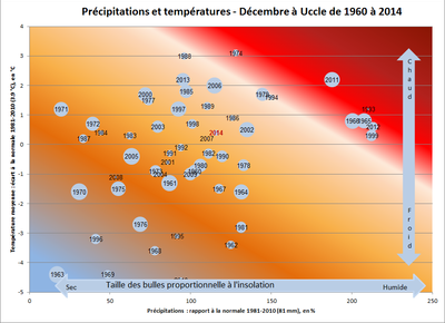 Remarque : à partir du bilan climatologique mensuel de janvier 2011, les normales et les valeurs record (+ et -) données dans le tableau ci-dessous sont calculées pour tous les paramètres sur la période 1981–2010. Cette période de 30 ans est la nouvelle période de référence choisie pour le calcul des normales (moyennes sur la période) à Uccle.