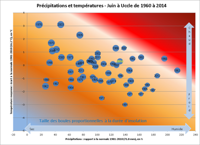 Remarque : à partir du bilan climatologique mensuel de janvier 2011, les normales et les valeurs record (+ et -) données dans le tableau ci-dessous sont calculées pour tous les paramètres sur la période 1981–2010. Cette période de 30 ans est la nouvelle période de référence choisie pour le calcul des normales (moyennes sur la période) à Uccle.