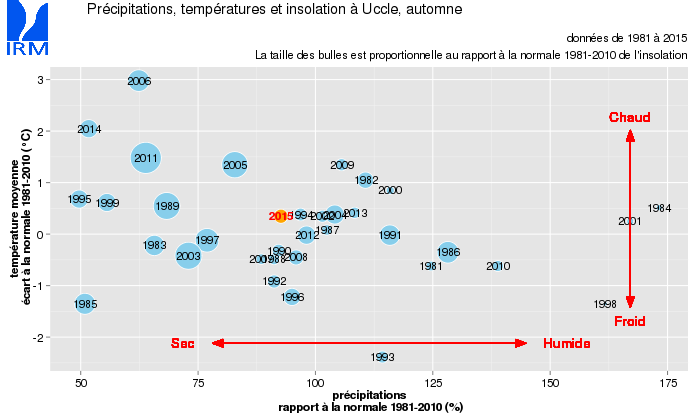 Le tableau ci-dessous est un bilan climatologique de l'automne 2015 (de septembre 2015 à novembre 2015) pour 4 paramètres. Cette saison peut être comparée aux automnes les plus extrêmes pour chacun des paramètres.