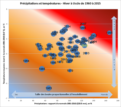 Le tableau ci-dessous est un bilan climatologique de l'hiver 2015 (de décembre 2014 à février 2015) pour 4 paramètres. Cette saison peut être comparée aux hivers les plus extrêmes pour chacun des paramètres.