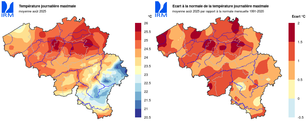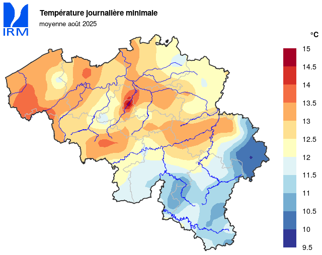 Sur l’ensemble de notre territoire, la température minimale la plus basse a été enregistrée le 25 août à Elsenborn (Bütgenbach) avec 0,0 °C. La température maximale la plus élevée a été enregistrée le 12 août à Dilbeek avec 35,0 °C.
