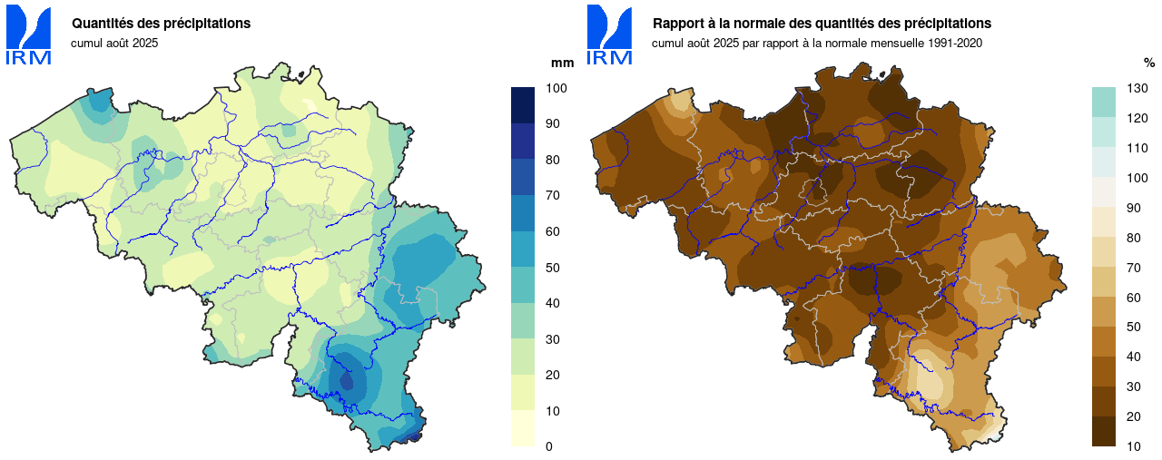 Sur l’ensemble de notre territoire, les totaux mensuels de précipitations ont partout été largement inférieurs à la normale. Dans la plupart des régions, il n'est tombé que 25 % à 30 % de la quantité normale de précipitations. La plupart des précipitations sont tombées en Lorraine belge (environ 64 % de la quantité normale).