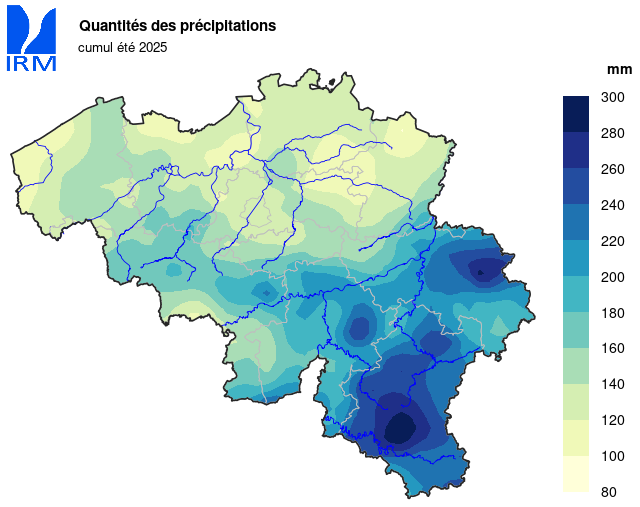 L'été 2025 a compté 35 jours de précipitations à Uccle (normale : 42,6 jours), avec un total de 130,0 mm de précipitations (normale: 234,2 mm). Cela fait de l'été 2025 le deuxième été le plus sec de la période de référence actuelle. Seul l'été 2022 a été encore plus sec (110,6 mm).
