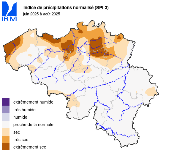Sur l’ensemble de notre territoire, les précipitations les plus faibles ont été enregistrées dans les polders et en Campine (environ 50 % de la quantité normale), tandis que les précipitations les plus importantes ont été enregistrées dans les Ardennes et en Lorraine belge (environ 90 % de la quantité normale).