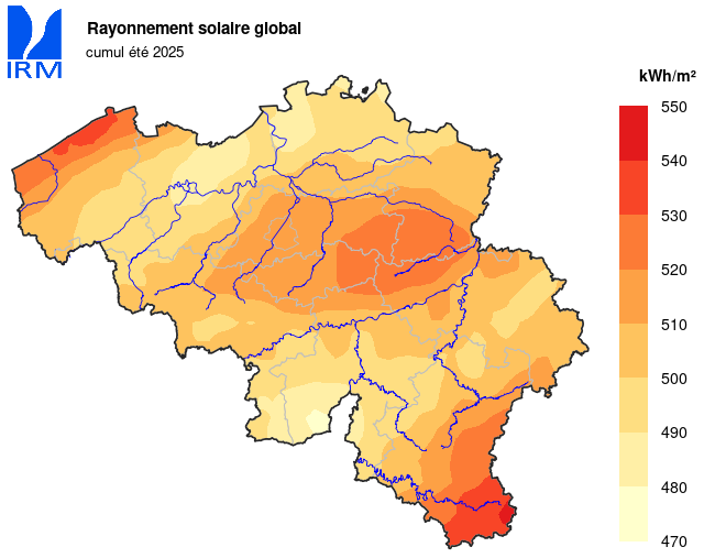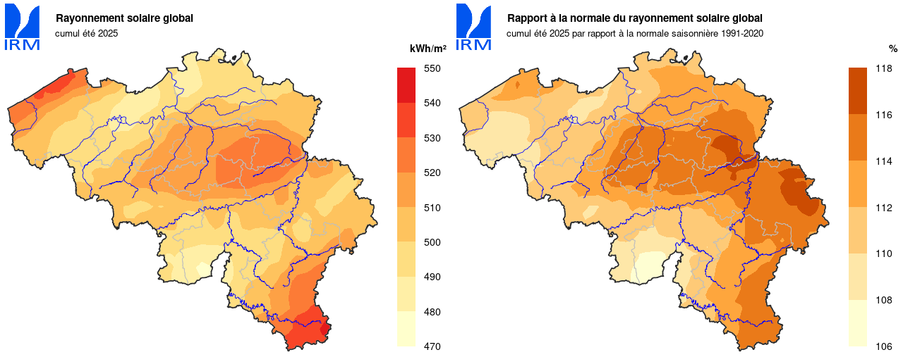 Les trois mois d'été ont tous été plus ensoleillés que la moyenne à Uccle. Au final, le soleil a brillé pendant 707 h 00 min cet été (normale : 594 h 56 min).