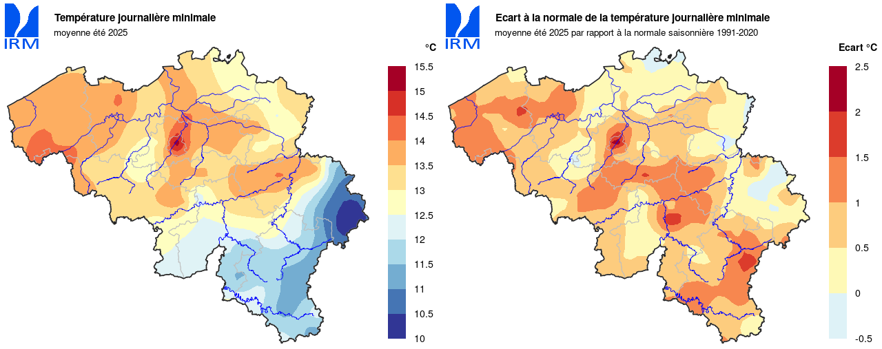 Sur l’ensemble de notre territoire, la température la plus élevée a été enregistrée le 2 juillet (38,3°C à Diepenbeek) et la température plus basse le 25 août (0,6°C à Elsenborn (Bütgenbach)).