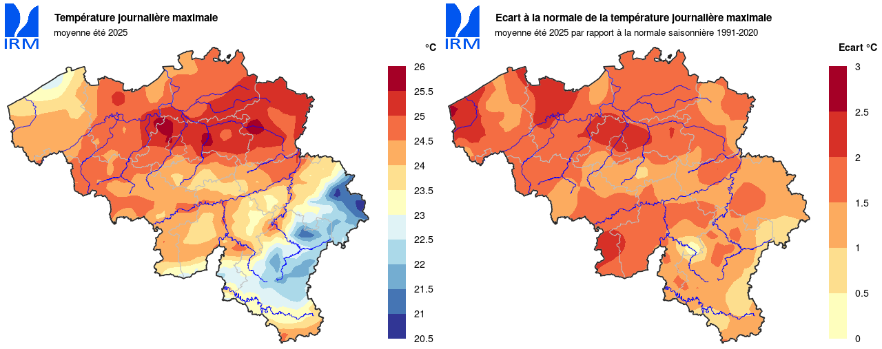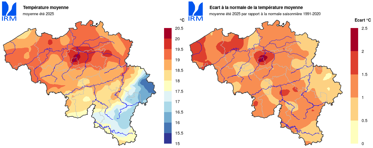 La température moyenne de l'été 2025, à Uccle, s’est élevée à 19,3 °C (normale : 17,9 °C). Cela fait de l'été 2025 le quatrième été le plus chaud depuis le début des mesures en 1833. Seuls les étés 2018 (19,9 °C), 2003 (19,7 °C) et 2022 (19,6 °C) ont été plus chauds.