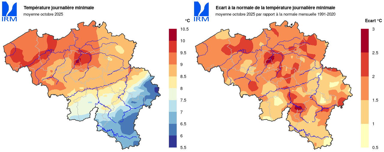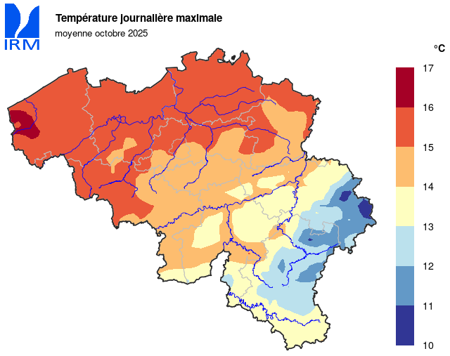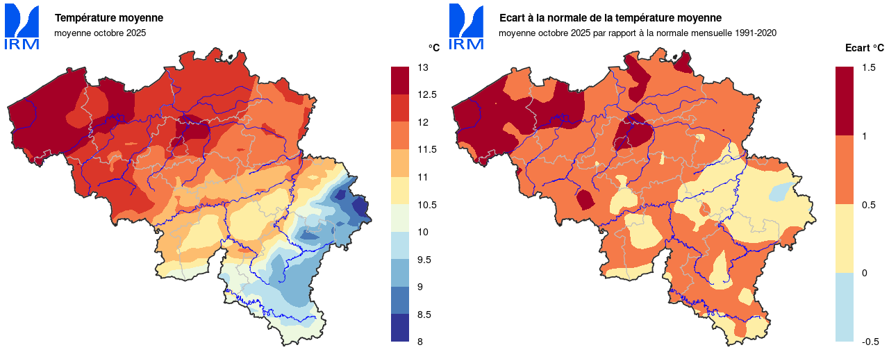 À Uccle, la température moyenne du mois d'octobre était de 12,0°C (normale : 11,3°C).  Les températures moyennes ont été supérieures à leurs normales respectives pendant la majeure partie du mois. Seuls le début du mois et la période du 24 au 27 octobre ont été légèrement plus froids que la normale.