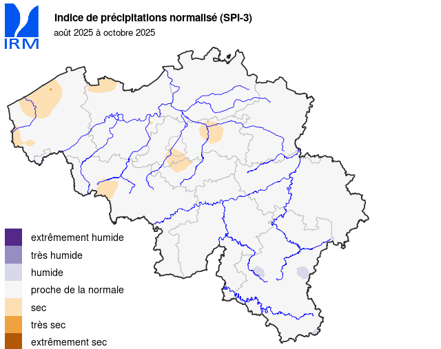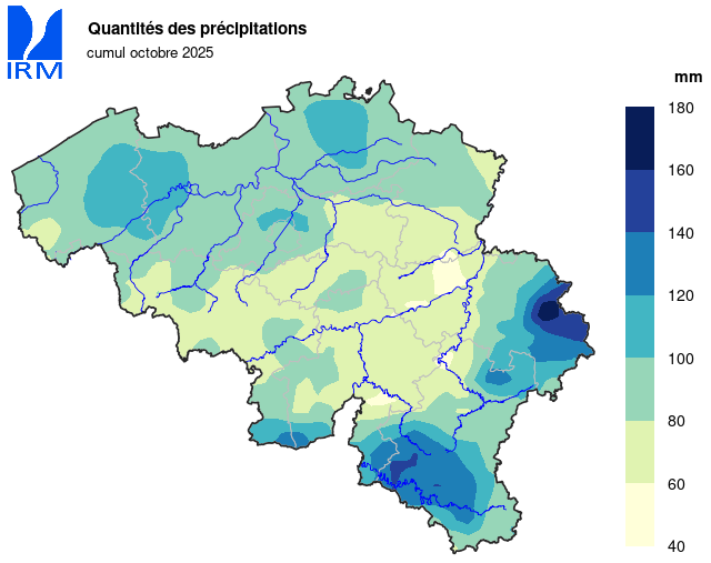 Sur l’ensemble de notre territoire, les précipitations mensuelles totales ont été proches ou supérieures à la normale. Les précipitations les plus faibles ont été enregistrées en Lorraine belge et dans le Condroz (environ 98 % de la normale) et les plus importantes dans la région de la Gileppe et de la Warche (environ 136 % de la normale).