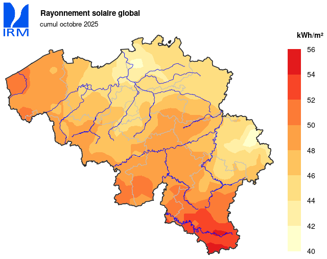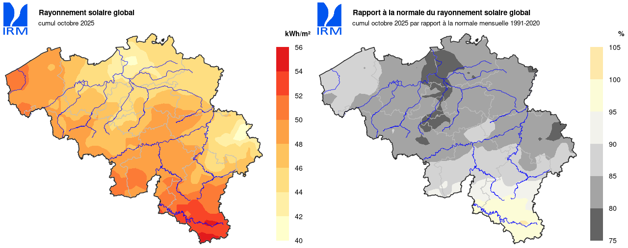 Le mois d'octobre a été très sombre. À Uccle, le soleil n'a brillé que durant 46 h 10 min (normale : 112 h 38 min). Il s'agit donc du deuxième mois d'octobre le plus sombre depuis le début des mesures en 1887. Seul le mois d'octobre 1998 a connu une durée d’ensoleillement encore plus faible (42 h 48 min).