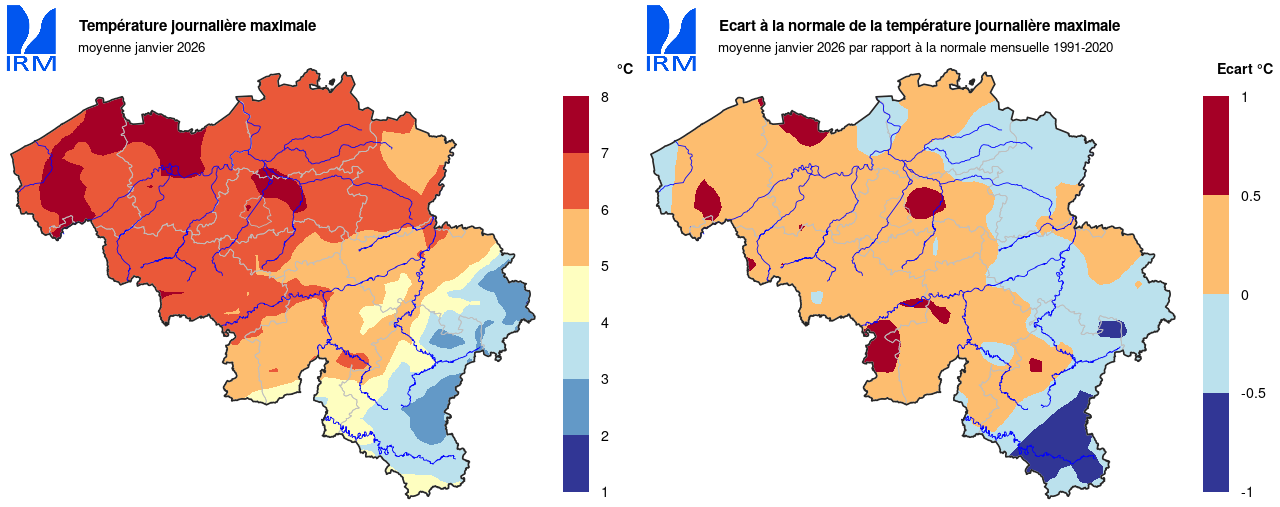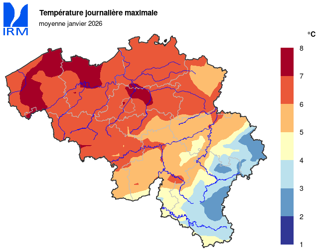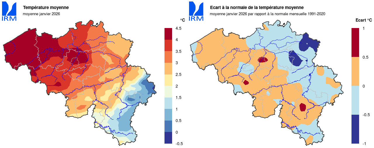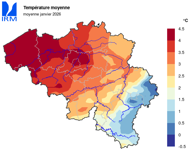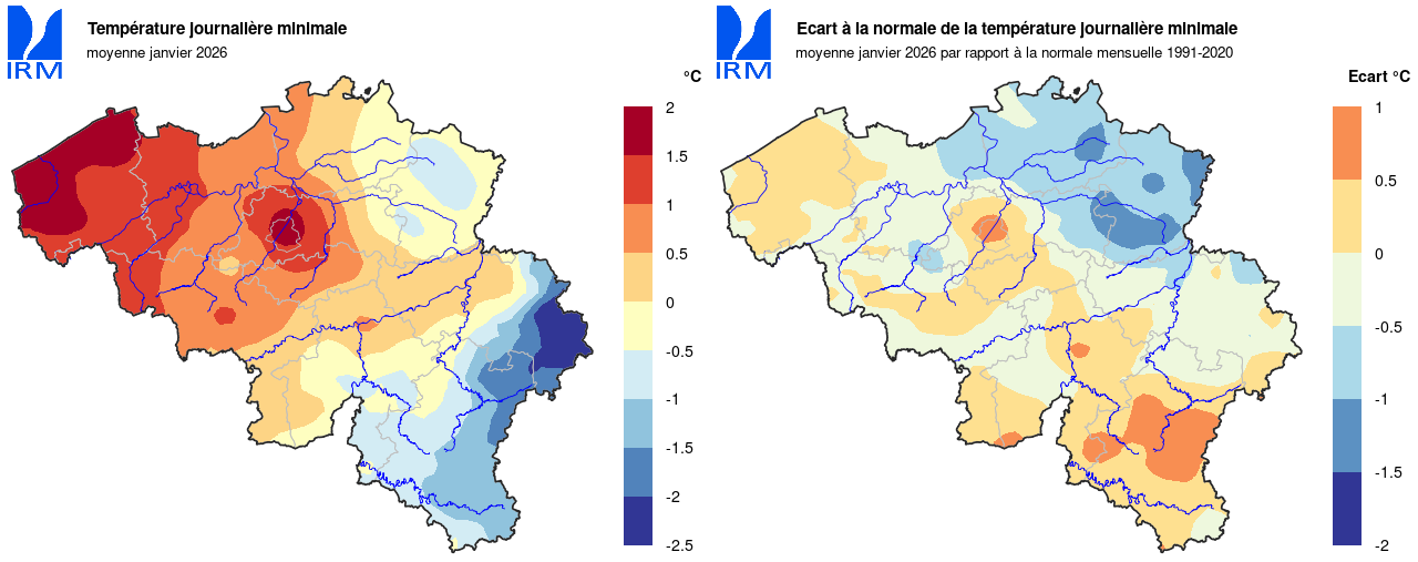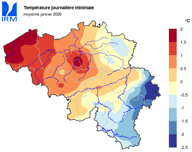 Sur l’ensemble de notre territoire, la température minimale la plus basse a été enregistrée le 5 janvier à Elsenborn (Bütgenbach) avec -12,2°C. La température maximale la plus élevée a été enregistrée le 17 à Korbeek-Lo (Bierbeek) et à Molenbeek-Saint-Jean avec 14,1°C.
