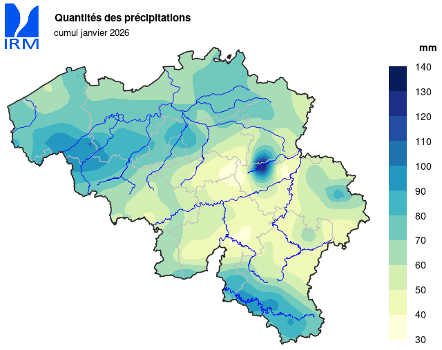 Au sein du réseau de mesure climatologique de l'IRM, le total journalier le plus élevé a également été enregistré le 9 janvier à Korbeek-Lo (Bierbeek) (39,4 mm).