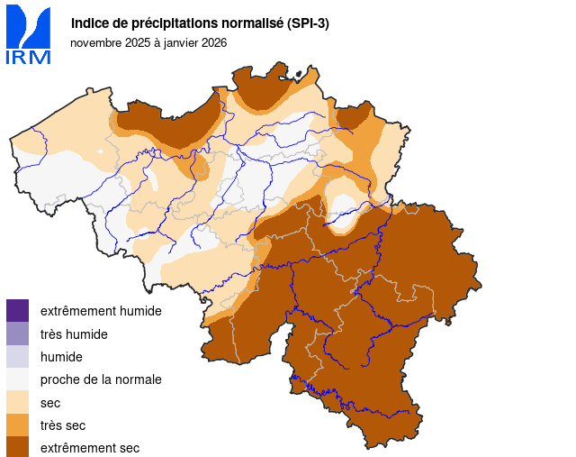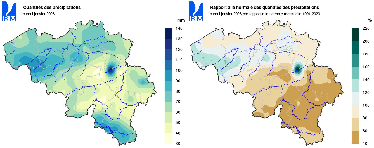Sur l’ensemble de notre territoire, les précipitations mensuelles totales ont oscillé autour des normales. Les précipitations les plus faibles ont été enregistrées dans les Ardennes et dans la région de la Gileppe et de la Warche (environ 50 % de la quantité normale), tandis que les précipitations les plus importantes ont été enregistrées en Flandre (environ 115 % de la quantité normale).