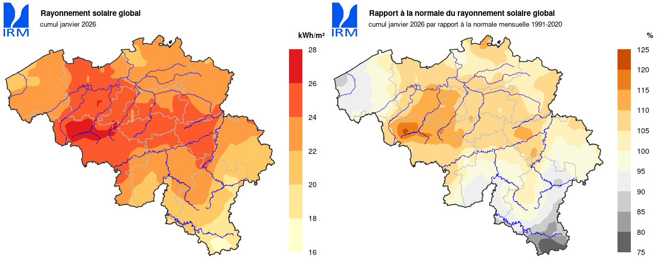 Pendant longtemps, tout semblait indiquer que janvier serait un mois plutôt ensoleillé à Uccle. La fin du mois très sombre – seulement 4 h 17 min de soleil pendant les 6 derniers jours (normalement : 12 h 47 min) – a fait que l'ensoleillement de ce mois a finalement été très proche de la valeur normale : 62 h 35 min (normalement : 59 h 04 min).