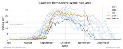 Le trou d’ozone est également suivi de manière quotidienne par des modèles. Vous retrouvez ci-dessous une simulation de l’évolution annuelle du trou d’ozone depuis 2003. Cette année, il a fallu pas mal de temps avant que le trou ne commence à se rétracter. (source : https://atmosphere.copernicus.eu/monitoring-ozone-layer)