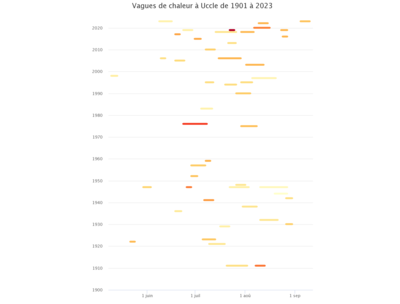 La figure ci-dessous présente les vagues de chaleur observées à Uccle depuis 1901. Chaque vague de chaleur est représentée par un segment horizontal étendu sur la période de l'année au cours de laquelle elle s'est produite. La couleur de chaque segment est fonction de l'intensité de la vague de chaleur (définie par la moyenne des températures maximales pendant la vague de chaleur). La version interactive de cette figure se trouve sur la page Canicules à Uccle.