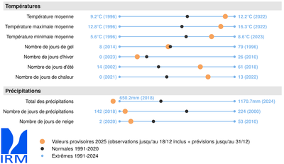 À l’heure actuelle (données jusqu’au 18/12/2025), la température moyenne de 2025 à Uccle s’élève à 12,3 °C. Cela place la température moyenne provisoire encore 0,1 °C au-dessus du record absolu de 2020 et 2022. Avec encore 13 jours à venir et une baisse des températures prévue à partir du 22 décembre, il est toutefois très probable que la température moyenne diminue encore. Selon les prévisions actuelles pour le reste de l’année, on atteindrait une température moyenne de 12 °C (normale : 11 °C). Ainsi, 2025 se classerait à la quatrième place du classement général (depuis 1833).
