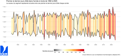 Fig. 3 : Premier et dernier jours d'été dans l'année à Uccle de 1892 à 2025