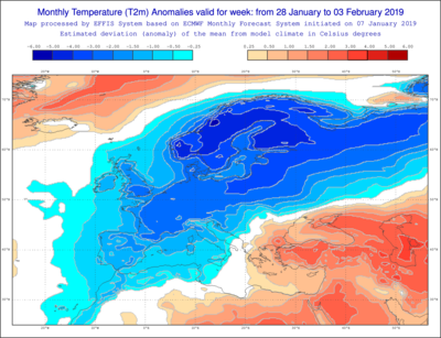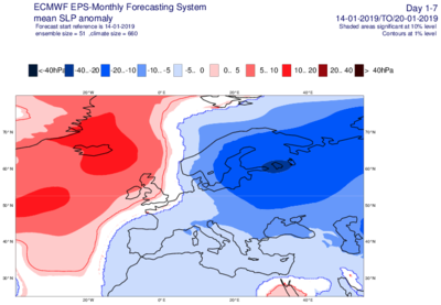 Figure 3. Cartes du modèle de prévision à long-terme ECMWF du 14 janvier concernant la prévision des anomalies de pression (par rapport à la normale) pour la période du 14 au 20 janvier ainsi que pour la période du 21 janvier au 27 janvier.
