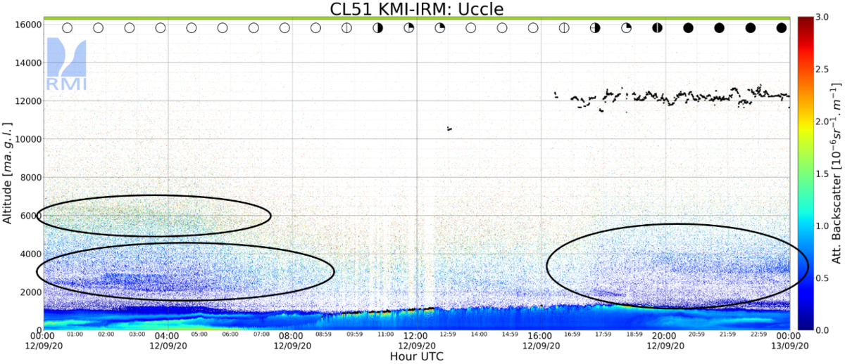 Observations du ceilomètre à Uccle avec détection des particules à 3 et 6km d'altitude.