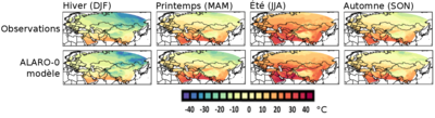 Comparaison entre les observations (en haut) et les calculs du modèle (en bas) de la température pour la période 1980 -2017 et pour les différentes saisons.