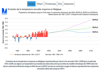 Vous y trouverez également une présentation des projections climatiques, avec les différents scénarios jusque 2100. Tout d’abord, sous une forme graphique de l’évolution de la température à Uccle.