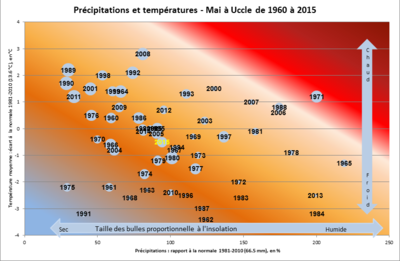 Remarque : à partir du bilan climatologique mensuel de janvier 2011, les normales et les valeurs record (+ et -) données dans le tableau ci-dessous sont calculées pour tous les paramètres sur la période 1981–2010. Cette période de 30 ans est la nouvelle période de référence choisie pour le calcul des normales (moyennes sur la période) à Uccle.