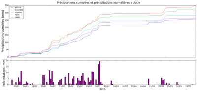 Au-dessus : Cumul des précipitations pour les stations de Beitem, Dourbes, Humain, Retie et Uccle. En dessous : Précipitations journalières à Uccle, pour la période du 1 janvier jusqu'au 24 mai 2020.