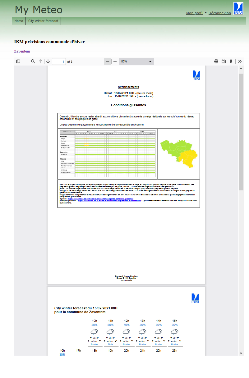 Les prévisions horaires ainsi que les avertissements peuvent être téléchargés au format PDF à partir de l’interface web sécurisée.
