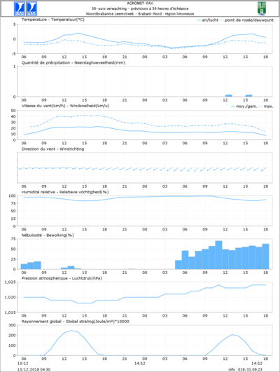 Indien u geabonneerd bent op de Agrometfax 36 uur, dan ontvangt u elke morgen omstreeks 7 uur een mail met de drie-uurlijkse verwachtingen, 36 uur ver, gebaseerd op de waarnemingen van middernacht. Zo beschikt u bij het krieken van de dag over de meest recente en nauwkeurige voorspellingen betreffende de lucht- en dauwpunttemperatuur, neerslaghoeveelheid, windsnelheid en maximale windsterkte, windrichting, relatieve vochtigheid, bewolking, globale straling en luchtdruk. Kortom, alle nodige meteorologische informatie om uw dag optimaal te kunnen plannen.