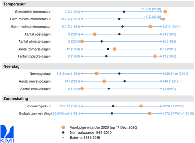 De winter van 2020 (december 2019, januari en februari 2020) staat op de derde warmste plaats sinds het begin van de metingen in Ukkel. Bovendien zakten sinds januari 2020 tot vandaag (donderdag 17 december 2020) de maximumtemperaturen in Ukkel nog geen enkele dag tot onder het vriespunt (zie figuur hierboven winterse dag).