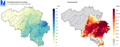 Links: verdeling van de 3-daagse neerslaghoeveelheid voor de periode 13 juli (8 CEST) tot 16 juli 2021(8 CEST); rechts: terugkeerperioden voor de neerslaghoeveelheden tijdens de periode 13 juli tot 16 juli 2021.