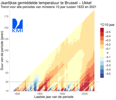Om het belang van een voldoende lange periode bij klimatologische trends te illustreren, toont bovenstaande figuur de trend in de jaargemiddelde temperatuur in Ukkel voor een periode van minstens 10 jaar of meer (y-as) tussen 1833 en 2021 (x-as). Elk gekleurd puntje stemt overeen met de temperatuurtrend voor één periode, waarbij de waarde op de verticale as de duur is van de periode, de waarde op de horizontale as het laatste jaar is van de respectievelijke periode en de kleur van het puntje de waarde is van de lineaire trend. Zo geeft bijvoorbeeld, het punt (1950, 30) de trend over de periode 1921-1950. De top van de driehoek geeft de trend over de totale periode 1833-2021. Voor perioden korter dan 30 jaar, onder de grijze horizontale lijn, zien we zowel opwarming (rood) als afkoeling (blauw). Perioden langer dan 30 jaar laten bijna allemaal een opwarming zien. Bovendien is de opwarming voor deze langere perioden groter naarmate ze recenter zijn. Zo is voor de afgelopen 31 jaar (1991-2021) de opwarming +3,4 °C per 100 jaar.