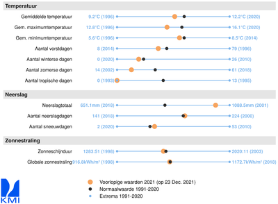 Op basis van de temperatuurverwachtingen t.e.m. 31 december, eindigt 2021 met een gemiddelde temperatuur van 10,7°C op de 26ste plaats in het lijstje met de 30 warmste jaren in Ukkel sinds het begin van de waarnemingen in 1833. 2021 is hiermee het eerste jaar met een gemiddelde jaartemperatuur onder de nieuwe normaalwaarde (11°C voor 1991-2020) en wellicht ook het koudste jaar sinds 2016. Het voorbije jaar was een jaar zonder hitterecords of hittegolven. Bovendien behaalde de maximumtemperatuur in Ukkel dit jaar geen enkele keer de 30°C of meer en staat hiermee de teller voor het aantal tropische dagen op 0.
