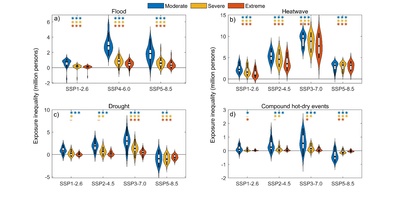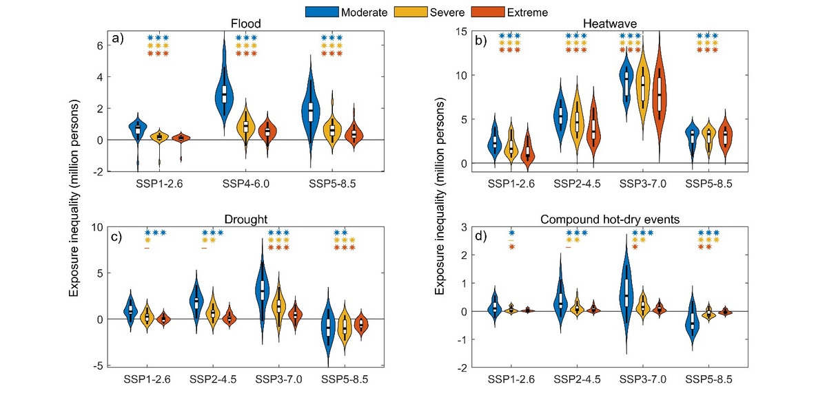 Ten tweede is de ongelijkheid in blootstelling duidelijk en vaak aanzienlijk. Hittegolven laten de grootste ongelijkheid tussen inkomensgroepen zien, terwijl gecombineerde hitte- en droogteperiodes de kleinste ongelijkheid laten zien. Voor overstromingen en hittegolven blijft de ongelijkheid aanzienlijk voor alle ernstniveaus en scenario's; voor droogte en gecombineerde gebeurtenissen hangt de significantie af van het scenario en de ernst. Opvallend is dat de ongelijkheid over het algemeen afneemt naarmate de gebeurtenissen extremer worden.
