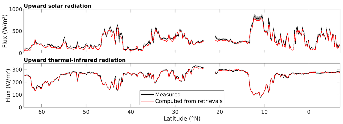 Vergelijking tussen de gemodelleerde (in het rood) en de waargenomen (in het zwart) fluxen door de breedbandradiometer voor een meertperiode van 15 minuten door de satelliet EarthCARE. Bron: ECMWF