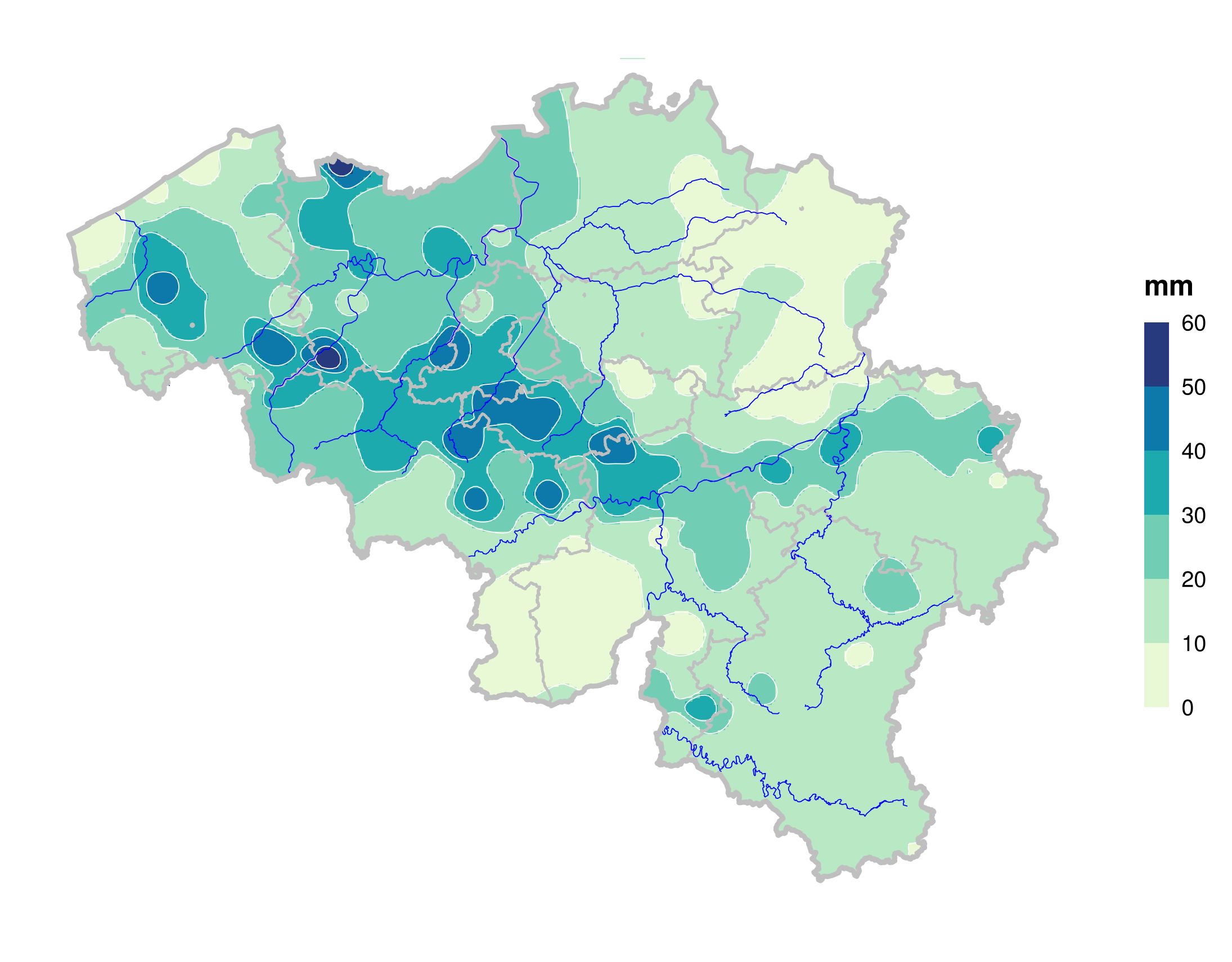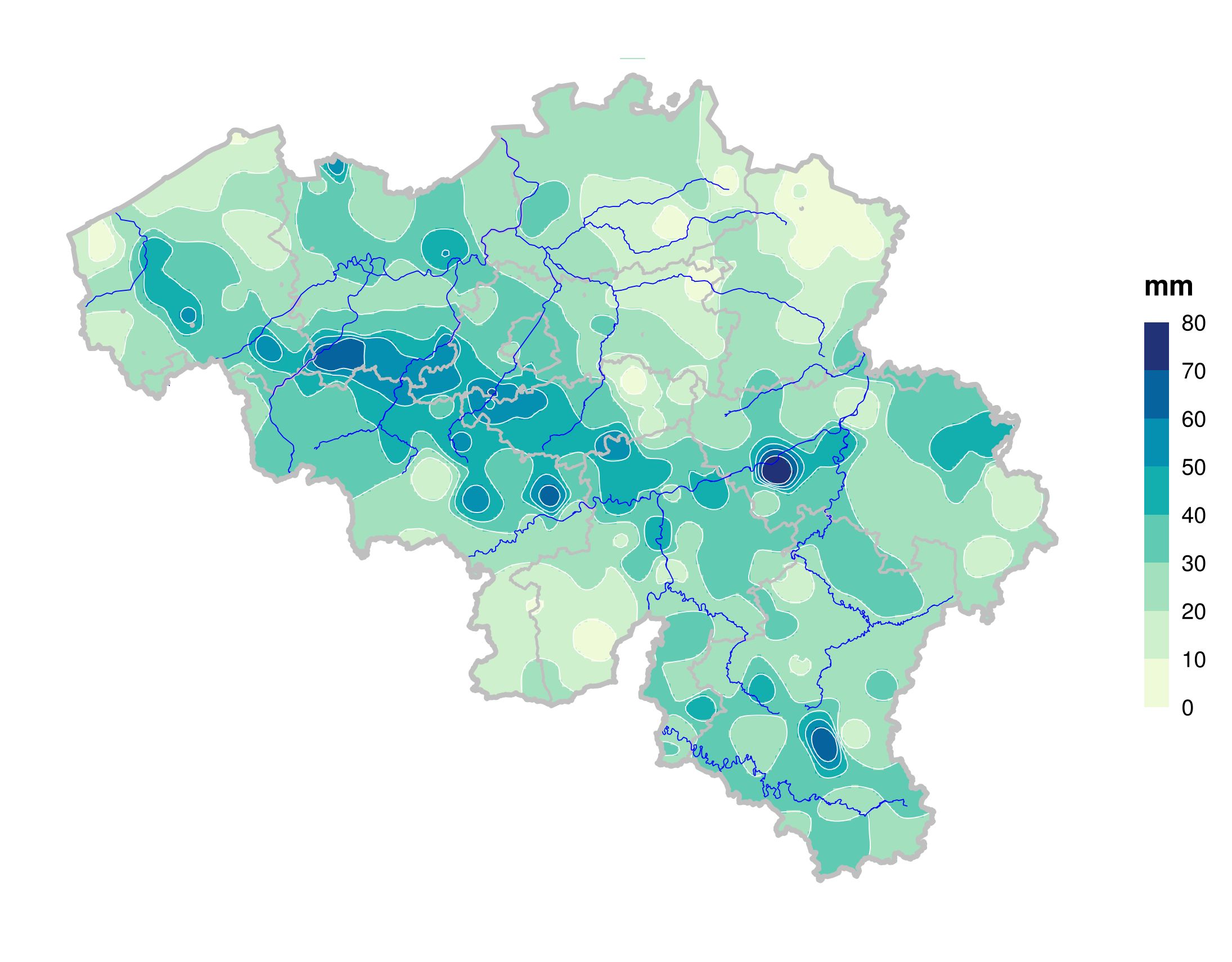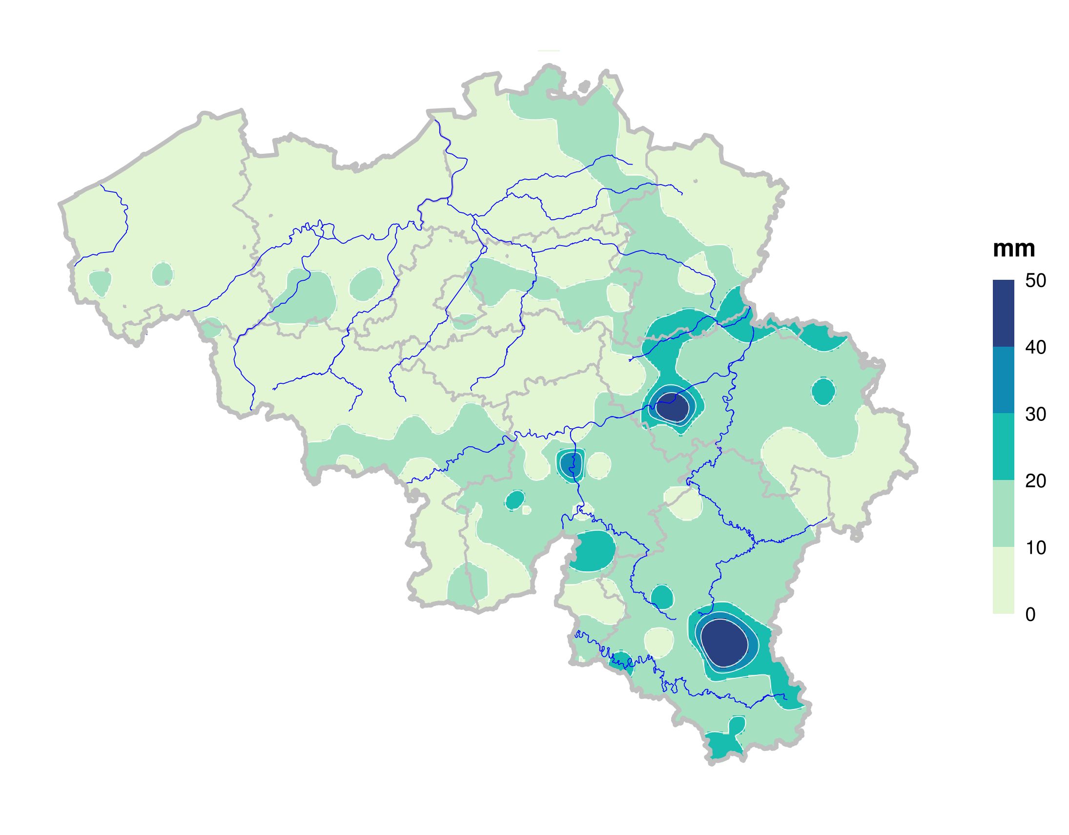 In juli variëren de normale maandelijkse neerslagwaarden tussen 60 mm aan de kust en 120 mm op de toppen van de Ardennen. Onweersbuien kunnen bijzonder intense neerslag veroorzaken: op 6 juli hebben we in La Louvière 24,3 mm in 1 uur geregistreerd en op 7 juli 33,2 mm in 1 uur in Neufchateau.