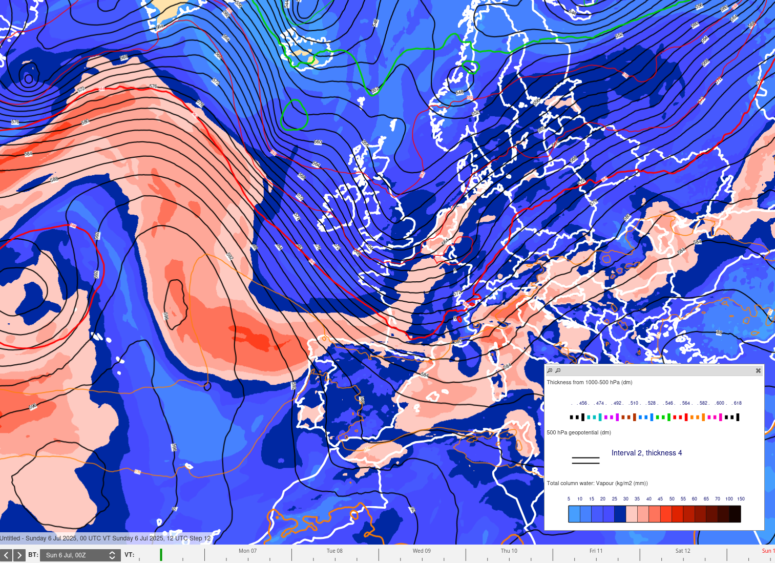 [gekleurde lijnen] = dikte tussen het isobare oppervlak 1000 hPa en 500 hPa, evenredig aan de gemiddelde temperatuur tussen deze twee oppervlakken.