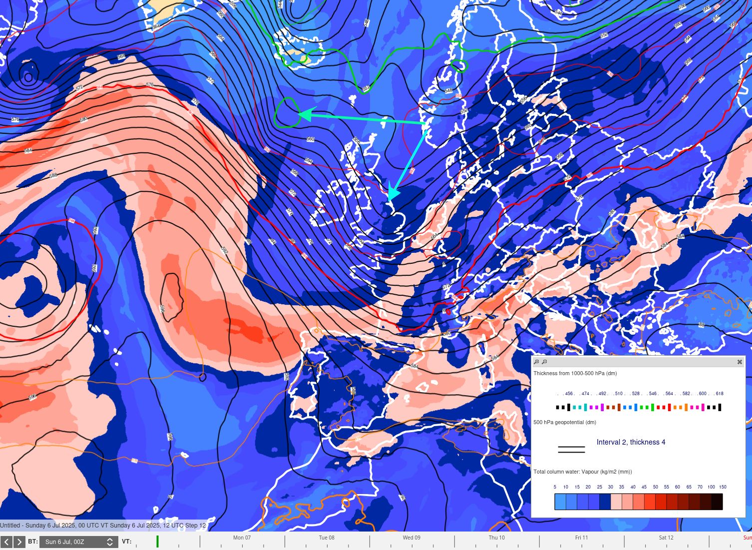[zwarte lijnen] = geopotentiële hoogte (in dam) van het isobare oppervlak op 500 hPa (ongeveer 6 km hoogte), waarbij de hoogteverschillen achter het frontale systeem worden benadrukt (ook aangegeven door de pijlen);