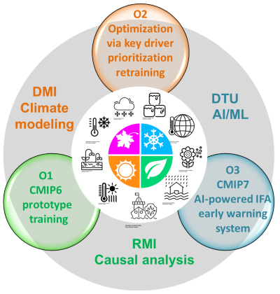 Het project wordt geleid door DMI (PI: Tian Tian), in samenwerking met KMI (PI: Stéphane Vannitsem) en DTU (PI: Tommy S. Alstrøm). Het project combineert de expertise van de drie groepen om het vroegtijdige waarschuwingssysteem te ontwikkelen: klimaatmodellering (DMI), causale analyse (KMI) en grootschalige AI (DTU). Via dit project krijgt het consortium exclusieve toegang tot de AI-supercomputer Gefion.