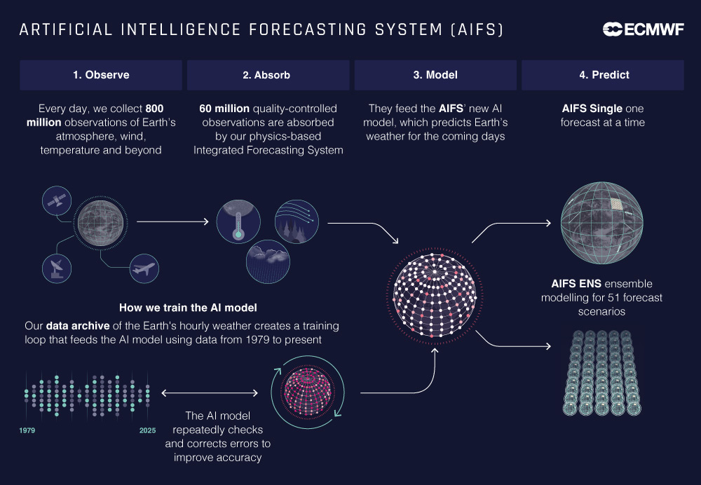 Op dinsdag 1 juli 2025 heeft het Europees Centrum voor Weersverwachtingen op Middellange Termijn (ECMWF) een eerste versie van het probabilistische model van het Artificial Intelligence Forecasting System (AIFS) gepubliceerd. Het model AIFS ENS v1 biedt een ensemblevoorspelling en werkt naast het traditionele, op fysica gebaseerde Integrated Forecasting System (IFS) om de numerieke weersvoorspelling te verbeteren. Het zeer nauwkeurige ensemblemodel vormt een aanvulling op het dienstenaanbod van ECMWF door gebruik te maken van de mogelijkheden van machine learning (ML) en kunstmatige intelligentie (AI). AIFS ENS levert niet alleen een voorspelling, maar ook een schatting van de onzekerheid van de voorspelling.