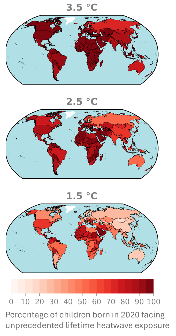 Als de wereldwijde temperatuur tegen 2100 met 3,5°C stijgt, zal 92% van de kinderen die in 2020 geboren worden, tijdens hun leven te maken krijgen met een ongeëvenaarde blootstelling aan hittegolven, waardoor 111 miljoen kinderen getroffen zullen worden. Als de doelstelling van 1,5°C van het Akkoord van Parijs wordt gehaald, kunnen 49 miljoen kinderen tegen dit risico worden beschermd. Dit is slechts voor één geboortejaar; als we in plaats daarvan rekening houden met alle kinderen die vandaag tussen 5 en 18 jaar oud zijn, worden 1,5 miljard kinderen getroffen in een 3,5°C-scenario en kunnen 654 miljoen kinderen worden beschermd door onder de 1,5°C-drempel te blijven.