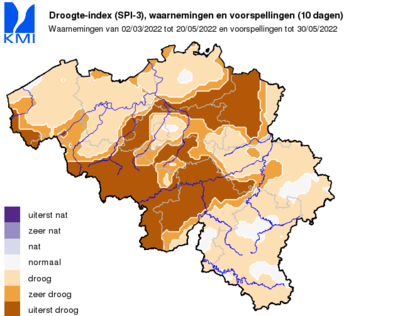 De droogte-index op wat langere tijdschaal (Standardized Precipitation Index voor een periode van 3 maand, of SPI-3, hieronder), toont zowel momenteel, als rekening houdende met de verwachtingen tot het einde van de maand, een uiterst droge toestand in een groot deel van het land.